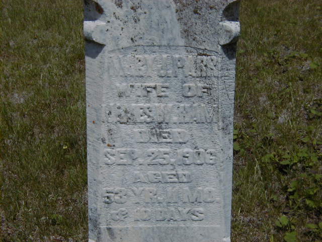 Mary Jane Parr was born on 15 October 1852 at Canada West; Date Oct 15 1852 per calc from Memorial - age 53y 11m 10d at death Sep 25 1906. Date 1853 & location Ont. per 1891 Census. Date 1850 & location Ont. per 1881 Census. Date Oct 15 1852 per Kemp GEDCOM sent to me via email by Cheryl Taber, March 14, 2006.1,4,2,3 As of before 1873,her married name was Ham.1 She married James Wright Ham, son of William Ham and Mary "Polly" Wright, before 1873 at Ontario; per Kemp GEDCOM sent to me via email by Cheryl Taber, March 14, 2006.1 Mary Jane Parr appeared on the census of April 1881 at Limerick & Cashel Twp.'s, North Hastings Co., Ontario; Age 31 at 1881 Census: James Ham.2 She appeared on the census of 22 April 1891 at Limerick Twp., North Hastings Co., Ontario; Age 38 at 1891 Census: see James W. Ham.3 She died on 25 September 1906 at Limerick Twp., St. Ola, Hastings Co., Ontario, at age 53; Date Sep 25 1906 per Memorial. Date Sep 25 1906 per Kemp GEDCOM sent to me via email by Cheryl Taber, March 14, 2006.1,4 She was buried on 27 September 1906 at St. Ola Cemetery, Limerick Twp., Hastings Co., Ontario; Memorial: (See Exhibit) Mary J. Parr; Wife of; James W. Ham; Died; Sep 25 1906; Aged; 53 yrs 11 mos; & 10 days (St. Ola Cemetery, Limerick Twp., June 23, 2006.)4
