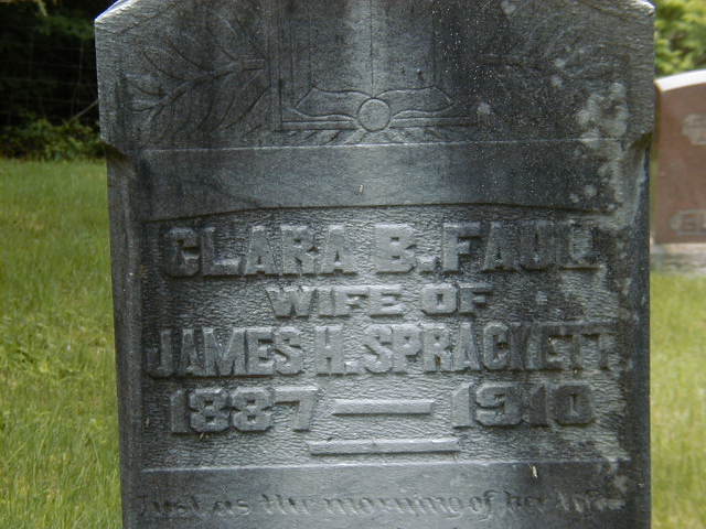 Clara B. Faul was born on 25 July 1887 at Ontario; Date Jul 25 1887 per 1901 Census.1 She appeared on the census of April 1901 at Tudor & Cashel Twp.'s, Hastings Co., Ontario; Age 13 at 1901 Census: see William Faul.1 As of 1907,her married name was Sprackett.2 She married James H. Sprackett in 1907 at Ontario; per Memorial of Clara B Faul.2 Clara B. Faul was buried in 1910 at Gunter Cemetery, Gunter, Hastings Co., Ontario; Memorial: (See Exhibit) Clar B. Faul; Wife of; James H. Sprackett; 1887 - 1910 (Gunter Cemetery, June 23, 2006.)2 She died in 1910 at Ontario; Date 1910 per Memorial.2