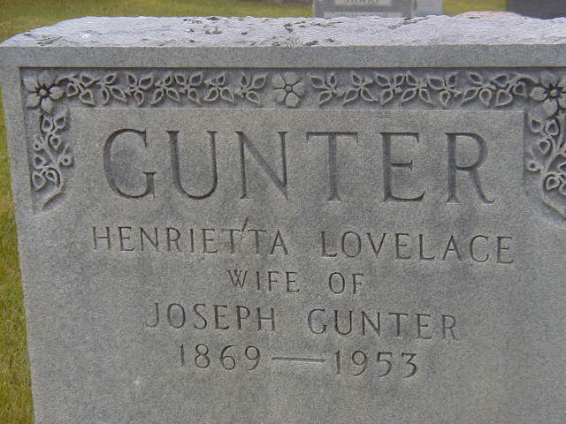 Henrietta Amanda Loveless was born on 21 February 1868 at Murray Twp., Northumberland Co., Ontario; Date 1869 per Burial. Date Feb 21 1868 per Kemp GEDCOM sent to me via email by Cheryl Taber March 14, 2006.1,4 She appeared on the census of April 1871 at Murray Twp., Northumberland Co., Ontario; Age 3 at 1871 Census: see Jonathan Loveless.3 She appeared on the census of April 1881 at Cashel & Limerick Twp.'s, Hastings Co., Ontario; Age 13 at 1881 Census: see Jonathan Loveless.2 As of 15 March 1883,her married name was Gunter.1 She married Joseph Gunter, son of Ephraim Gunter and Louisa "Ann" Kemp, on 15 March 1883 at Cashel Twp., Gunter, Hastings Co., Ontario; per Kemp GEDCOM sent to me via email by Cheryl Taber March 14, 2006.1 Henrietta Amanda Loveless died in 1953 at Ontario; per Kemp GEDCOM sent to me via email by Cheryl Taber March 14, 2006.1 She was buried in 1953 at Stockdale Cemetery, Murray Twp., Stockdale, Northumberland Co., Ontario; Memorial: (See Exhibit) GUNTER; Henrietta Lovelace; Wife of; Joseph Gunter; 1869 - 1953 (Stockdale Cemetery, May 26, 2006)