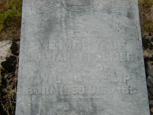CEMSearch: Name: Hulda M. Kemp; Maiden: Palmer; Born: 1859; Died: 1911; Notes: Wife of Wilmot Kemp; Buried: Gunter Cemetery, Cashel Twp., Hastigns Co; Other names: Wilmot Kemp.4,3