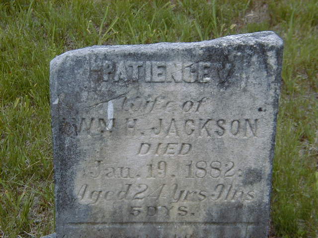 Patience Victoria Kemp was born on 4 June 1856 at Percy Twp., Northumberland Co., Ontario; Date Apr 14 1857 per Memorial. Date June 4 1856 per Kemp GEDCOM sent to me via email by Cheryl Taber, March 14, 2006.1 As of 22 September 1879,her married name was Jackson.1 She married William Henry Jackson, son of Adonijah Jackson and Mary Melissa Wilson, on 22 September 1879 at Cashel Twp., Hastings Co., Ontario; per Kemp GEDCOM sent to me via email by Cheryl Taber, March 14, 2006.1 Patience Victoria Kemp died on 19 January 1882 at Cashel Twp., Gunter, Hastings Co., Ontario, at age 25; Date Jan 19 1882 per Memorial. Date Jan 19 1882 per Kemp GEDCOM sent to me via email by Cheryl Taber, March 14, 2006.1,2 She was buried on 21 January 1882 at Gunter Cemetery, Cashel Twp., Gunter, Hastings Co., Ontario; Memorial: (See Exhibit) Patience; Wife of; Wm. H. Jackson; Died; Jan 19 1882; Aged; 24 yrs. 9 mo; 5 dys (Gunter Cemetery, Gunter, June 23, 2006.)2