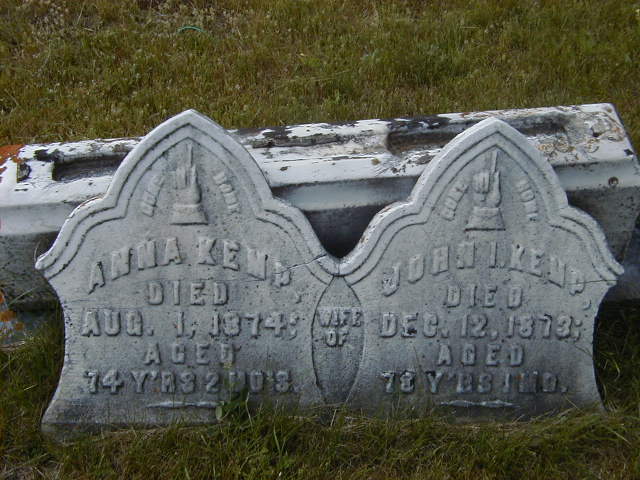 CEMSearch: Name: John I. Kemp; Born: - ; Died: 1873-12-12; Age: 78y 01m 00d; Notes: Husband of Anna (?) Kemp ( -1874); Buries: Carrying Place Cemetery, Murray; Other names: Anna Kemp ( -1874.)2,3