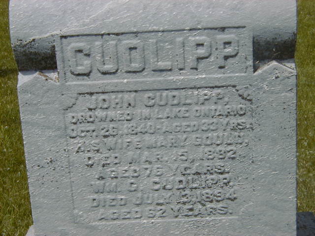 John Cudlipp was born in 1807 at Lifton, Devon, England; Date 1807 - Age 33 yrs at death in 1840 - per Burial. Locaton Lifton, England per Death Reg'n of daughter Priscilla (Cudlipp) Weeks. per Kemp GEDCOM sent to me via email by Cheryl Taber, March 14, 2006. Date 1807 & location Lifton, Devon, England per family tree of donnaweekssawyer on ancestry.ca, Dec 8 2017.1,2,3,4 He married Mary Gould before 1830 at Ontario; per Burial. per Kemp GEDCOM sent to me via email by Cheryl Taber, March 14, 2006.2 John Cudlipp died on 26 October 1840 at Lake Ontario, Consecon, Prince Edward Co., Ontario; Date Oct 26 1840 & " Drowned in Lake Ontraio" per Burial. Date Oct 26 1840 & location Consecon per family tree of donnaweekssawyer on ancestry.ca, Dec 8 2017.2,3 He was buried on 28 October 1840 at Consecon Cemetery, Ameliasburg Twp., Consecon, Prince Edward Co., Ontario; Memorial: (See Exhibit) CUDLIPP; John Cudlipp; Drowned in Lake Ontario; Oct 26 1840 - Age 33 Yrs; His Wife Mary Gould; Died Mar 15 1882; Aged 76 Years; Wm. G. Cudlipp; Died July 13 1894; Aged 62 Yrs. (Consecon Cemetery, May 28, 2006.)2