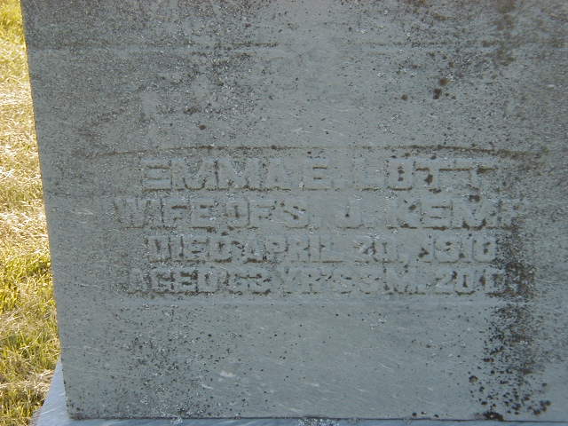 CEMSearch: Name: Emma E. Kemp; Maiden: Lott; Born: - ; Died: 1910-04-20; Age: 63y 3m 20d; Notes: Wife of S. J. Kemp; Buried: Salem Cemetery, Sec NW; Other names: Samuel J. Kemp ( -1908), Stephen M. Kemp ( -1906.)2,3