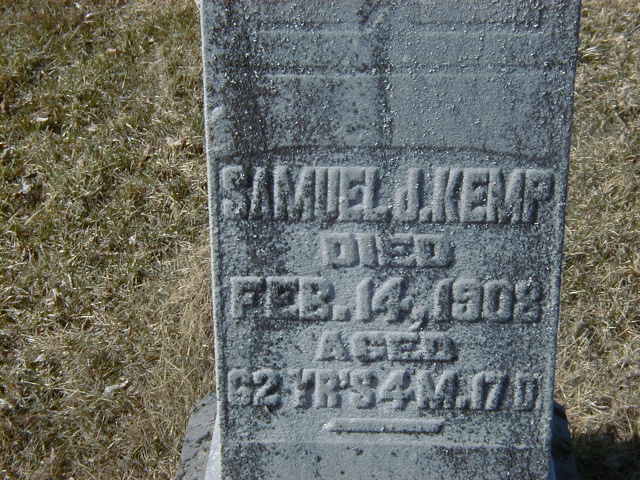 CEMSearch: Name: Samuel J. Kemp; Born: - ; Died: 1908-02-14; Age: 62y 4m 17d; Buried: Salem Cemetery. Cramahe Twp., Sec NW; Other names: Emma E. Kemp (Lott) ( -1910), Stephen M. Kemp ( -1906.)5,2