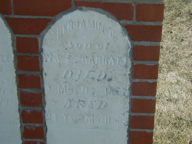 Benjamin C. Garratt was born on 31 May 1853 at Brighton Twp., Northumberland Co., Canada West; Date May 31 1853 per Burial. Date 1853 & location Ont. per 1871 Census.1,2 He appeared on the census of April 1871 at Brighton Twp., Northumberland Co., Ontario; Age 18 at 1871 Census: see William Garratt.1 He died on 11 September 1877 at Brighton Twp., Northumberland Co., Ontario, at age 24; Date Sep 11 1877 per Burial.2 He was buried on 13 September 1877 at Wooler Friends Cemetery, Brighton Twp., Northumberland Co., Ontario; Memorial: (See Exhibit) Benjamin C; Son of; W & E. Garratt; Died; 9 Mo. 11 D's 18??; Aged; 24 Ys 3 Mo 11 D's (Wooler Friends Cemetery, Brighton Twp., Apr 2 2006)