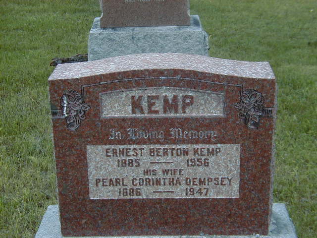 CEMSearch: Name: Ernest Burton Kemp; Born: 1885; Died: 1956; Notes: Husband of Pearl Corintha (Dempsey) Kemp (1886-1947); Buried: Carrying Place Cemetery, Murray Twp; Other name: Pearl Corintha Kemp (Dempsey) (1886-1956.)2,3