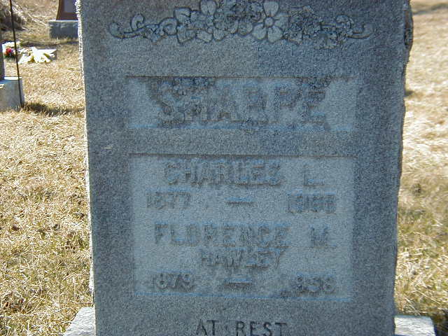 Charles L. Sharpe was born in 1877 at Murray Twp., Northumberland Co., Ontario; Date 1877 per Burial. Date 1878 & location Ont. per 1891 Census. Date 1877 & location Ont. per 1881 Census. Date Jan 1876 & location Murray Twp. per family tree of beardr59 on ancestry.ca, Sep 30 2023.1,2,3,4 He appeared on the census of April 1881 at Murray Twp., Northumberland East Co., Ontario; Age 4 at 1881 Census: see Edgar Sharpe.4 He appeared on the census of April 1891 at Murray Twp., Northumberland East Co., Ontario; Age 13 at 1891 Census: see Edgar Sharpe.3 He married Florence Marietta Hawley, daughter of Isaac Hawley and Ellen Jane Richards, on 30 April 1902 at Northumberland Co., Ontario; per Burial. Date Apr 30 1902 & location Northumberland Co. per family tree of beardr59 on ancestry.ca, Sep 30 2023.1,2 Charles L. Sharpe died on 8 November 1965 at Trenton, Hastings Co., Ontario; Date 1965 per Burial. Date Nov 8 1968 & location Trenton per family tree of beardr59 on ancestry.ca, Sep 30 2023.1,2 He was buried on 10 November 1965 at Wooler Friends Cemetery, Brighton Twp., Northumberland Co., Ontario; Memorial: (See Exhibit) SHARPE; Charles L; 1877 - 1965; Florence M; Hawley; 1879 - 1938 (Wooler Friends Cemetery, Brighton Twp., Apr 2, 2006.)1