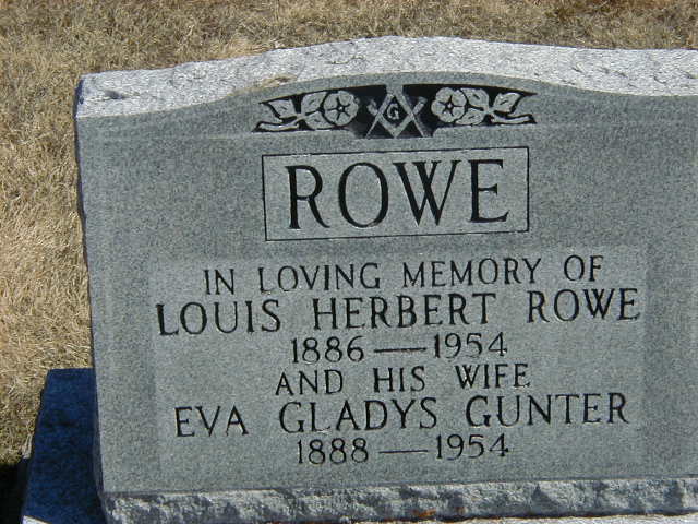 Louis Herbert Rowe was born on 30 June 1886 at Brighton Twp., Northumberland Co., Ontario; Date 1886 per Memorial. Date Jun 30 1886 & location Ont. rural per 1901 Census. Date 1886 & location Brighton Twp. per marriage reg'n. - Eva Gladys Gunter.1,3,2 He appeared on the census of April 1901 at Brighton Twp., Northumberland Co., Ontario; Age 14 at 1901 Census: see George Rowe.3 He lived on 4 February 1914 at Brighton Twp., Northumberland Co., Ontario; Residence Brighton Twp. per marriage reg'n. - Eva Gladys Gunter.2 He married Eva Gladys Gunter, daughter of Samuel Theodore Gunter and Alice Rosey Scott, on 4 February 1914 at Murray Twp., Northumberland Co., Ontario; Marriage Reg'n.#016383: Groom: Louis Herbert Rowe; Age: 27; Res. & Born: Brighton Twp; Status: bachelor; Occ.: farmer; Rel.: Meth; Parents: George Rowe & Ettie Hennessy; Bride: Eva Gladys Gunter; Age: 24; Res. & Born: Murray Twp; Status: spinster; Rel.: Meth; Parents: Samuel T. Gunter & Alice Scott; Wit.: Howard B. Rowe, Hilton & Goldie Gunter, Trenton; Date: Feb 4 1914; Place: Murray Twp; Performed by: R. Archibald Delve, Wooler, Meth; Sworn: Trenton, Jan 30 1914; Reg'r.: Mrs. DeMille Blakely, Trenton (Ontario Marriage Registration, #016383-1914, ancestry.ca) per 1911 Census. per Burial.1,4,5 Louis Herbert Rowe lived on 22 July 1930 at Wooler, Northumberland Co., Ontario; Informant for Death Reg'n. of his brother Howard B. Rowe.6 He died in 1954; Date 1954 per Burial.1 He was buried in 1954 at McPhail's Cemetery, Brighton Twp., Northumberland Co., Ontario; Memorial: (See Exhibit) ROWE; In Loving Memory of; Louis Herbert Rowe; 1886 - 1954; And His Wife; Eva Gladys Gunter; 1888 - 1954 (McPhail's Cemetery, Brighton Twp., Apr 2 2006.)1