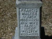 DAte Mar 1898 & location Ont. per 1911 Census. Date Mar 6 1899 & location Ont. rural per 1901 Census. Date 1898 & location Brighton Twp. per marr. reg'n.1,2,3,4 She appeared on the census of April 1901 at Brighton Twp., Northumberland Co., Ontario; Age 2 at 1901 Census: see Peter Peister.1 She appeared on the census of 7 June 1911 at Brighton Twp., Northumberland Co., Ontario; Age 13 at 1911 Census: see Peter Peister.4 As of 7 December 1918,her married name was Oliver.5 She married Francis Walter Oliver, son of Peter Oliver and Josephine Cheer, on 7 December 1918 at Brighton, Northumberland Co., Ontario; Marriage Reg'n.#014015: Groom: Frank Walter Oliver; Age: 28; Res. & Born: Brighton Twp; Status: bachelor; Occ.: farmer; Rel.: Meth; Parents: Peter Oliver & Josephine Dale; Bride: Hazel Peister; Age: 20; Res. & Born: Brighton Twp; Status: spinster; Rel.: Meth; Parents: Peter Peister & Nettie Sills; Expected Res.: Brighton Village; Wit.: Mrs. Riley Michael, Brighton & Mrs. J. E. Pettet, Brighton; Date: Dec 7 1918; Place: Brighton; Performed by: J. E. Pettet, Brighton, Bapt; Sworn: Colborne, Dec 6 1918; Reg'r.: H. J. Mayhew (Ontario Marriage Registration, #014015-1918, ancestry.com)