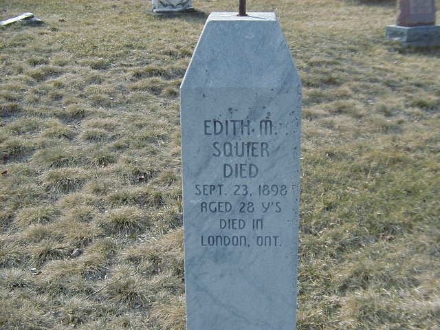 Edith M. Squier was born in 1870 at Brighton Twp., Northumberland Co., Ontario; Date 1870 per Memorial. Date 1870 & location Ont. per 1881 Census. Date 1869 & location Ont. per 1871 Census. Date 1869 per "Descendants of Ichabod Squier" sent to me via email by Gerry Hannah, Dec 28 2008.1,3,2,4 She appeared on the census of April 1871 at Sidney Twp., Hastings West Co., Ontario; Age 2 at 1871 Census: see Isaac Squier.4 She appeared on the census of April 1881 at Brighton Twp., Northumberland Co., Ontario; Age 11 at 1881 Census: see Flora Squier (mother.)1 She died on 23 September 1898 at London, Middlesex Co., Ontario; Date Sep 23 1898 & location London, Ont. per Burial. Date Sep 23 1898 & location London, Ont. per "Descendants of Ichabod Squier" sent to me via email by Gerry Hannah, Dec 28 2008.3,2