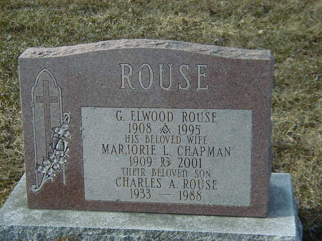 Charles A. Rouse was born in 1933 at Ontario; Date 1933 per Burial.1 He was buried in 1988 at Woods Cemetery, Cramahe Twp., Northumberland Co., Ontario; Memorial: (See Exhibit) ROUSE; G. Elwood Rouse; 1908 - 1995; His Beloved Wife; Marjorie L. Chapman; 1909 - 2001; Their Beloved Son; Charles A. Rouse; 1933 - 1988 (Woods Cemetery, Cramahe Twp., Apr 2 2006.)1 He died in 1988; Date 1988 per Burial.1