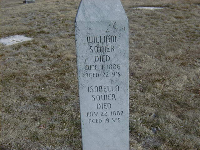 William R. Squier was born in 1864 at Brighton Twp., Northumberland Co., Canada West; Date 1864 & location Ont. per 1881 Census. Date 1864 & location Ont. per 1871 Census. Date 1864 per "Descendants of Ichabod Squier" sent to me via email by Gerry Hannah, Dec 28 2008.1,2,3 He appeared on the census of April 1871 at Sidney Twp., Hastings West Co., Ontario; Age 7 at 1871 Census: see Isaac Squier.3 He appeared on the census of April 1881 at Brighton Twp., Northumberland Co., Ontario; Age 17 at 1881 Census: see Flora Squier (mother.)1 He died on 11 June 1886 at Brighton Twp., Northumberland Co., Ontario; Date Jun 11 1886 per Burial.4 He was buried on 13 June 1886 at Woods Cemetery, Cramahe Twp., Northumberland Co., Ontario; Memorial: (See Exhibit) William; Squier; Died; Jun 11 1886; Aged 22 Y's; Isabella; Squier; Died; July 22 1882; Aged 19 y's (Woods Cemetery, Cramahe Twp., Apr 2, 2006.)4