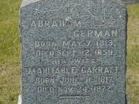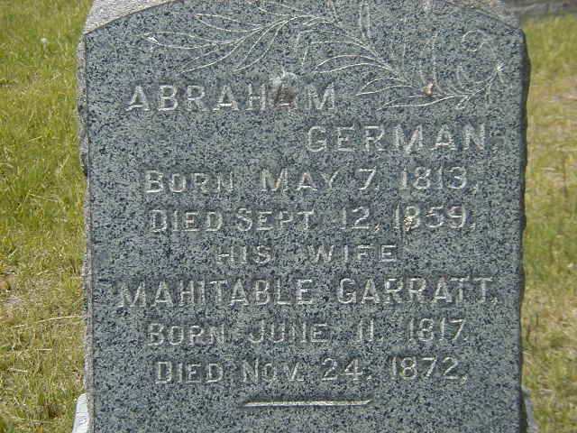 Abraham German was born on 7 May 1813 at Hillier Twp., Prince Edward Co., Upper Canada; Date May 7 1813 per Memorial. Date 1812 & location Cda. per 1851 Census. Date May 7 1813 & location Cda. per family tree of Davy Kembel, ancestry.com, Aug 12 2009. per GEDCOM of Meredith Mullett-Bulloch, May 9, 2006.1,4,3,2 He married Mahitable Garratt, daughter of Joseph Garratt and Lydia Clark, on 21 January 1834 at Hillier Twp., Prince Edward Co., Upper Canada; Date Jan 21 1834 & location Hillier Twp. per family tree of Davy Kembel, ancestry.com, Aug 12 2009.1,3 Abraham German appeared on the census of March 1852 at Brighton Twp., Northumberland Co., Canada West; Age 39 at 1851 Census: German, Abraham, 39, b. Cda., WM, yeoman, married; Mehitable, 35, b. Cda., WM, married; Lydia Jane, 18; Sarah Eliza, 14; Jonathan, 12 (1851 Census: Brighton Twp., pg. 116 of 160, line 46 - ancestry.com.)4 He was buried on 12 September 1859 at Wellington Cemetery, Wellington, Prince Edward Co., Canada West; Memorial: (See Exhibit) Abraham; German; Born May 7, 1813; Died Seot. 12, 1859; His Wife; Mahitable Garratt Born June 11, 1817; Did Nov. 24, 1872 (Wellington Cemetery, Wellington, Prince Edward Co., May 28 2006, by Dan.)2 He died on 12 September 1859 at Wellington, Prince Edward Co., Canada West, at age 46; Date Sep 12 1859 per Memorial. Date Sep 5 1859 & locatin Wellington per family tree of Davy Kembel, ancestry.com, Aug 12 2009.3,2