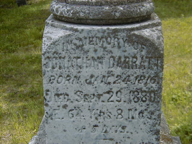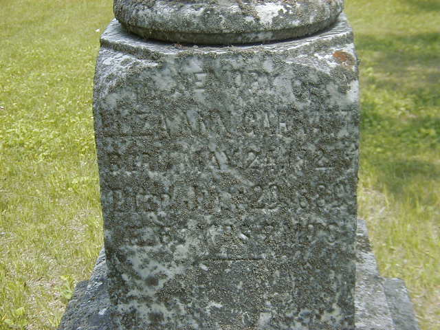 Eliza Ann German was born on 24 May 1822 at Hillier Twp., Prince Edward Co., Upper Canada; Date May 24 1822 per Memorial. Date May 24 1822 & location Hillier Twp. per FindaGrave. Date 1821 & location Cda. per 1851 Census. per GEDCOM of Doug Norman, May 9, 2006. Date 1823 & location Cda. per 1861 Census.1,2,5,3,4 As of before 1838,her married name was Garratt.1 She married Jonathan Garratt, son of Joseph Garratt and Lydia Clark, before 1838 at Prince Edward Co., Upper Canada; per 1851 Census. per GEDCOM of Meredith Mullett-Bulloch, May 9, 2006.1,2 Eliza Ann German appeared on the census of 1851 at Hillier Twp., Prince Edward Co., Canada West; Age 30 at 1851 Census: see Jonathan Garratt.2 She appeared on the census of April 1861 at Hillier Twp., Prince Edward Co., Canada West; Age 38 at 1861 Census: see Jonathan Garratt.5 She died on 29 July 1889 at Trenton, Hastings, Ontario, at age 67; Date Jul 29 1889 per Memorial. Date Jul 20 1889 & location Trenton per FindaGrave.3,4 She was buried on 31 July 1889 at Chadsey Cemetery, Athol Twp., Prince Edward Co., Ontario; Memorial: (See Exhibit) In Memory of; Eliza Ann Garratt; Born May 24 1822; Died Jul 29 1889; AE 67 Yrs 2 Mos (Chadsey Cemetery, Athol Twp., May 28, 2006)