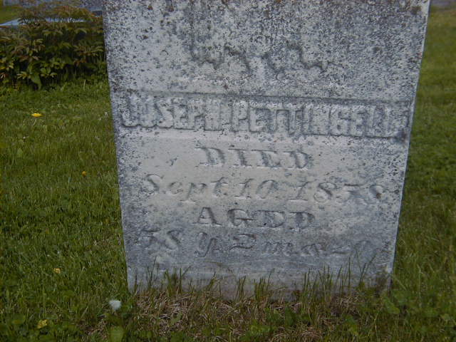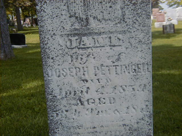 Joseph Pettingill was born on 12 June 1800 at Florida Twp., Montgomery Co., New York, U.S.A; Date Jun 12 1800 per age 58y 2m 29d at death Sep 10 1858 - per Memorial. Date Jun 24 1800 per GEDCOM of Leonard Parren, Oct. 22, 2006. Date c. 1801 & location Florida Twp., Montgomery Co., NY per GEDCOM of Marje Vargas, Oct. 22, 2006. Date 1799 & location USA per 1851 Census. per GEDCOM of Meredith Mullett-Bulloch, May 9, 2006. Date 1802 per age 20 on 1822 Militia List. Location Prince Edward Co. per Death Reg'n of son Robert Pettingill.1,2,3,4,5 He lived circa 1818 at Prince Edward Co., Ontario; "Settled in Prince Edward county, Ontario, about 1818. ... (p 508, A Pettingell Genealogy (1906))" per GEDCOM of Leonard Parren, Oct. 22, 2006.1 He "Pettingale, Joseph, 20" per list of Prince Edward Co. Militia - Ontario Registers CD. in 1822 at Prince Edward Co., Ontario.3 He married Jane McCartney before 1824 at Ontario; per 1851 Census. per GEDCOM of Meredith Mullett-Bulloch, May 9, 2006.2 Joseph Pettingill "Dist. Prince Edward, To wit; Samuel Pettingell of the Township of Hallowell maketh oath and saith that his late Father, Samuel Pettingill who lived in Hillier and also at Kingston is the same person who is on the U. E. List as Sam'l Pettingell of Fredericksburgh that Allen Pettingill & Martin Pettingill are his brothers - and that they as well as Martha Ann Pettingill, Mary Osgterhout, Harriet Stevenson, Catharine Pettingill, Hannah Garrett, William Pettingill, Joseph Pettingill & Arnot Pettingill are children of the aforementioned Samuel Pettingell of Fredericksburgh, a U. E. Loyalist. ... Sworn before me at Hallowell this 3rd day of July, 1834 ... Thomas Nash, Cour' Kings Bench, P. E. District ... Samuel Pettingill" (Item 131c, Upper Canada Land Petitions "P" Bundle 18, 1833-35 (RG 1, L 3, Vol. 408), Reel 2731A, Ontario Archives) on 3 July 1834 at Hillier Twp., Prince Edward Co., Upper Canada.6 He lived on 5 January 1835 at Hillier Twp., Prince Edward Co., Upper Canada; "PETTINGILL, Samuel of Kingston; William of Hillier. OC 3 Oct 1833; Catharine. OC 3 Oct 1833. Hillier; Harriett, m. ---Stevenson of Hillier. OC 3 Oct 1833; Hannah, m. Adam Garrett of Hillier. OC 1 May 1834; Maria, m. John Osterhout of Hallowell. OC 1 May 1834; Martha Ann. OC 19 June 1834; Allen of Hillier. OC 18 July 1834; Samuel of Hallowell. OC 18 July 1834; Martin of Hillier. OC 18 July 1834; Arnot (son) of Hillier. OC 5 Jan 1835; Joseph of Hillier. OC 5 Jan 1835." (Sons & Daughters of American Loyalists - Ontario Registers CD.)7 He lived on 16 October 1838 at Prince Edward Co., Upper Canada; Witness to marriage of sister Hannah (Garratt, Pettingill) McDonald.8 He lived in 1843 at Conc 2 Lot 11, Hillier Twp., Prince Edward Co., Canada West; Land Registry Records (Patent) show that the Patent from the Crown for 100 acres, west 1/2 of Lot 11, Conc 2, Hillier Twp., was obtained by Joseph Pettingill in 1843.9 He lived in 1846 at Conc 1 Lake Side Lot 7, Hillier Twp., Prince Edward Co., Canada West; Land Registry Records (B&S: 4707) show that Joseph Pettingill & wife sold 37 acres of the rear part of Lot 7, Conc 1 Lake Side to William Pettingill (William Clarke held this lot earlier.)9 He lived on 27 September 1847 at Conc 2 Lot 10, Hillier Twp., Prince Edward Co., Canada West; Land Registry Records (Patent) show that the Patent from the Crown for 100 acres, west 1/2 of Lot 10, Conc 2, Hillier Twp., was obtained by Joseph Pettingill, Sep 27 1847.9 He appeared on the census of 1852 at Hillier Twp., Prince Edward Co., Canada West; Age 52 at 1851 Census: Pattingall, Joseph, 52, b. USA, WM, farmer, married; Jane, 46, b. Cda., WM, married; Mary, 26, b. Cda., WM, Milliness, single; Lide Ann, 20; Lydia J., 17; Robert, 15; Wm. H., 9; Stapleton, Mary J., 4.2 He died on 10 September 1858 at Hillier Twp., Prince Edward Co., Canada West, at age 58; Date Sep 10 1858 per Memorial. Date Sep 13 1858 per GEDCOM of Leonard Parren, Oct. 22, 2006.1,5 He was buried on 12 September 1858 at Wellington Cemetery, Wellington, Prince Edward Co., Canada West; Memorial: (See Exhibit) Joseph Pettingell; Died; Sept. 10, 1858; 58y 2m & 29 d. (Wellington Cemetery, Wellington, May 28 2006.)5