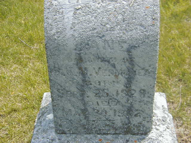 Peter Vermilyea was born on 9 February 1825 at Ontario; Date 1826 & location Ont. per 1871 Census. Date Feb 9 1825 per Memorial. per GEDCOM of Doug Norman, May 9, 2006.1,2,3 He married Jane Garratt, daughter of Townsend Garratt and Sarah T. Bowerman, on 22 September 1851 at Hastings Co., Ontario; per GEDCOM of Doug Norman, May 9, 2006.1 Peter Vermilyea appeared on the census of April 1871 at Hillier Twp., Prince Edward Co., Ontario; Age 45 at 1871 Census: Vermilyea, Peter, 45, b. Ont., Eng., WM, farmer, married; Jane, 38, b. Ont., Eng., WM, married; Netta, 17; Della, 12; Peter, 16; Mary, 73, b. USA, widow; Jane, 42, b. Quebec, single (1871 Census: Hillier Twp., div. 2, pg. 6, line - Conc 1, Lot 15 & 16, 150 acres, owner.)3 He lived in April 1871 at Conc 1 Lot 15 & 16, Hillier Twp., Prince Edward Co., Ontario; Residence per 1871 Census: Conc 1, Lot 15 & 16, Hillier Twp., 150 acres, owner.3 He died on 23 December 1874 at Ontario at age 49; Date DEc 23 1874 per Memorial.2 He was buried on 25 December 1874 at Chadsey Cemetery, Athol Twp., Prince Edward Co., Ontario; Memorial: (See Exhibit) Peter Vermilyea; Died; Dec 23, 1874; Aged 49 Yrs., 10 Mo; & 14 days (Chadsey Cemetery, Athol Twp., May 28, 2006.)2