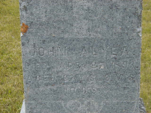 John Alyea was born on 17 July 1825 at Ameliasburgh Twp., Prince Edward Co., Upper Canada; Date Jul 17 1825 per calc from Memorial - age 67y 9m 10d at death Apr 27 1893. Date 1825 & location CW per 1861 Census. Date 1825 & location Cda. per 1851 Census. per GEDCOM of David D. Oakerson, May 11, 2006. Date 1826 & location Ont. per 1871 Census. Location Ameliasburg per Death Reg'n.1,2,3,4,5,6 He married Elizabeth Ann Brown, daughter of Alfred Nelson Brown and Elizabeth Mikel, circa 1847 at Ameliasburgh Twp., Prince Edward Co., Canada West; per GEDCOM of David D. Oakerson, May 11, 2006.1 John Alyea appeared on the census of 1851 at Ameliasburgh Twp., Prince Edward Co., Canada West; Age 26 at 1851 Census: Alyea, John, 26, b. Cda., EM, farmer, married; Eliza A., 23, b. Cda., EM, married; Peter N., 3; Henry, 26, b. Cda., EM, farmer, married; Catharine, 23, b. Cda., EM, married; Elizabeth L., 1.2 He appeared on the census of April 1861 at Ameliasburg Twp., Prince Edward Co., Canada West; Age 36 at 1861 Census: Alyea, Johm, 36, b. CW, E., farmer, married; Elizabeth A., 33, b. CW, married; Peter N., 12; James H., 5.3 He appeared on the census of April 1871 at Ameliasburg Twp., Prince Edward Co., Ontario; Age 45 at 1871 Census: Alyea, John, 45, b. Ont., Ger., EM, farmer, married; Elizabeth, 43, b. Ont., Ger., EM, married; Peter N., 21, b. Ont., Ger., EM, married; Lousy A., 18, b. Ont., Ger., EM, married; James H., 14; Brown?, Ann D., 7 (1871 Census: Ameliasburg, div. 2, pg. 5, line 18 - Conc 2, Lot 99, 122 acres.)4 He died on 8 June 1893 at Ameliasburg Twp., Prince Edward Co., Ontario, at age 67; Death Reg'n.#015177: Name: John Alyea; Date June 8 1893; Age: 68y; Res.: Ameliasburg; Born: Ameliasburg; Occ.: farmer; Cause: cancer of face, many years; Phys.: Dr. Thornton; Inf.: J. S. Alyea, Consecon, yeoman; Reg'd.: June 19 1893; Reg'r.: James Benson (Ontario Death Registration, ancestry.com, #015177-1893)