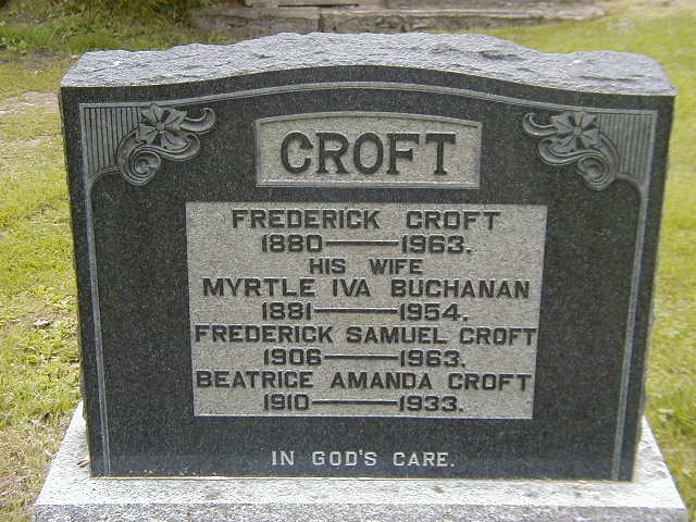 Frederick Samuel Croft was born in September 1906 at Thurlow Twp., Hastings Co., Ontario; Date 1906 per Memorial. Date Sep 1906 per 1911 Census.1,3 He appeared on the census of 1911 at Thurlow Twp., Point Anne, Hastings Co., Ontario; Age 4 at 1911 Census: see Frederick Croft.1 He was buried in 1963 at Belleville Cemetery, Belleville, Hastings Co., Ontario; Memorial: (See Exhibit) CROFT; Frederick Croft; 1880 - 1963; Myrtle Iva Buchanan; 1881 - 1954; Frederick Samuel Croft; 1906 - 1963; Beatrice Amanda Croft; 1910 - 1933 (Belleville Cemetery, June 10, 2006)
