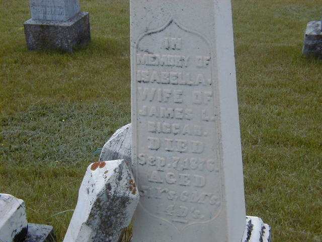 Isabella Hodgins was born on 3 March 1825 at Dublin, Ireland; Date Mar 3 1825 per Memorial - age 51y 6m 4d at death Sep 7 1876. Date 1825 & location Ireland per 1871 Census. Date 1825 & location Ireland per 1861 Census. Date 1824 & location Ireland per 1851 Census. Date 1825 & location Dublin per GEDCOM of Arnold E. Krause, June 5, 2006.1,3,4,5,6 As of 23 June 1846,her married name was Biggar.1 She married James Lyons Biggar, son of Charles Biggar and Camilla Coltman, on 23 June 1846 at Cobourg, Northumberland Co., Canada West; "22 July 1846: At Cobourg on 23rd June, James L. Biggar, merchant, of Murray, & Isabella, daughter of the late William Hodgins, of Dublin, Ireland. (Rev. Dr. Ryerson)" per Ontario Marriage Notices from Christian Guardian, 1836-1849, pg. 146 of 436 - ancestry.com. Date 1845 per GEDCOM of Simon (keane.simon@gmail.com) Nov 20 2016. per GEDCOM of Arnold E. Krause, June 5, 2006.1,2 Isabella Hodgins appeared on the census of 1852 at Murray Twp., Northumberland Co., Ontario; Age 27 at 1851 Census: see James L. Biggar.5 She appeared on the census of April 1861 at Murray Twp., Northumberland Co., Ontario; Age 36 at 1861 Census: see James L. Biggar.3 She appeared on the census of April 1871 at Murray Twp., Northumberland East Co., Ontario; Age 46 at 1871 Census: see James L. Biggar.4 She died on 7 September 1876 at Toronto, York Co., Ontario, at age 51; Date Sep 7 1876 per Memorial. Date 1881 & location Toronto per " Dylan Keane Ancestros" on ancestry.com, Dec 2 2016. per GEDCOM of Arnold E. Krause, June 5, 2006.1,7,6 She was buried on 9 September 1876 at Carrying Place Cemetery, Murray Twp., Carrying Place, Northumberland Co., Ontario; Memorial: (see Exhibit) In; Memory of; Isabella; Wife of; James L; Biggar; Died; Sep. 7, 1876; Aged; 51 Y'rs, 6 M's; 4 D's (Carrying Place Cemetery, Murray Twp., image by Dan Jun 6 2006.)6