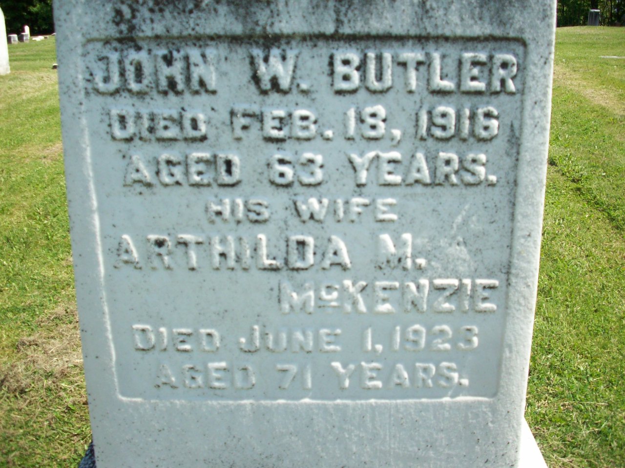 "Butler: In Brighton, on Friday, Feb. 18th, John Wallace Butler, aged 63 years. The funeral service was held at his late residence, Prince Edward St., on Sunday, 20th inst., and interment took place at Mount Hope cemetery." from pg. 030 of Newspaper Clippings, a collection donated by Shawnee Spencer to the Brighton Digital Archives, 2022.5,10,11 He was buried on 20 February 1916 at Mount Hope Cemetery, Brighton, Northumberland Co., Ontario; Memorial: (See Exhibit) John W. Butler; Died Feb. 18, 1916; Aged 63 Years; His Wife; Arthilda M; McKenzie; Died June 1, 1923; Aged 71 Years (Mount Hope Cemetery, Brighton, Jun 5 2009.)5