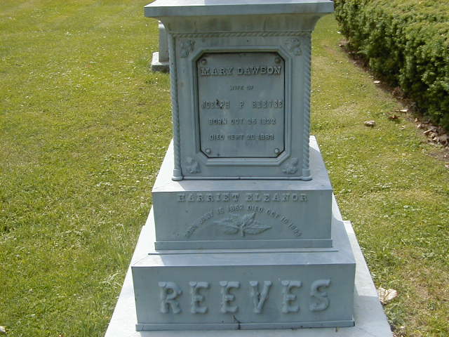Mary Dawson was born on 25 November 1822 at Ontario; Date Nov 25 1822 per Memorial. Date 1826 & location Ont. per 1901 Census.1,2 She married Joseph P. Reeves before 1844 at Ontario; per 1901 Census. per 1881 Census.3 As of before 1844,her married name was Reeves.1 Mary Dawson appeared on the census of April 1881 at Belleville, Hastings Co., Ontario; Age 55 at 1881 Census: see Joseph P. Reeves.3 She died on 20 September 1887 at Ontario at age 64; Date Sep 20 1887 per Memorial.2 She was buried on 22 September 1887 at Belleville Cemetery, Belleville, Hastings Co., Ontario; Memorial: (See Exhibiti) Mary Dawson; Born Nov. 25 1822; Died Sep 20 1887; Harriett Eleanor; Born Jany 16 1869 - Died Oct 10 1883? (Belleville Cemetery, Belleville, June 22, 2006.)2