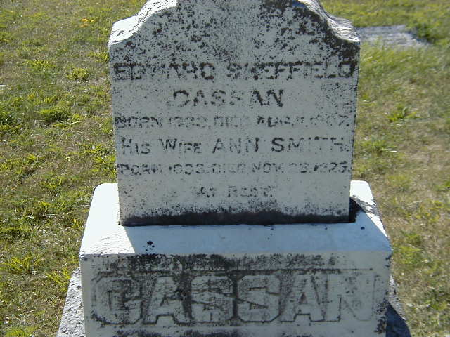 Note: Matthew Cassan age 29 and wife Christine are immediately below.6 He lived in April 1871 at Conc 1 Lot 14, Seymour Twp., Northumberland Co., Ontario; Residence per 1871 Census: Conc 1, Lot 14, Seymour Twp., 175 acres, owner.4 He appeared on the census of April 1871 at Seymour Twp., Northumberland Co., Ontario; Age 36 at 1871 Census: Cassan, Edward, 36, b. Ireland, Irish, CE, farmer, married; Ann, 35, b. Ont., Irish, CE, married; Mary, 12; Charlotte, 9; Eliza, 8; Letitia, 5; Alfred, 2; Lavinia, 1/12 - Mar (1871 Census: Seymour Twp., div. 2, pg. 11, line 11 - Conc 1, Lot 14, 175 acres, owner.)4 He lived in 1878 at Conc 1 Lot 14, Seymour Twp., Northumberland Co., Ontario; County Atlas: Name: Edward S. Cassan; Nativity: Ireland; Occ.: farmer; Township: Seymour; County: Northumberland; Post Office: Campbellford; Settled: 1834; Date: 1878; Conc & Lot: I, 14 - 175 acres & III, 12 - 50 acres.11 He appeared on the census of April 1881 at Seymour Twp., Northumberland Co., Ontario; Age 46 at 1881 Census: Cassan, Edward, 46, b. Ireland, farmer, married; Ann, 47, b. Ont., married; Mary E., 21, b. Ont; Charlot, 19; Eliza Jane, 16; Letitia, 14; Alfred, 12; Levenia, 9; Heneryatta, 7; Earnest, 2 (familysearch.org.)2 He appeared on the census of April 1891 at Seymour Twp., Northumberland Co., Ontario; Age 57 at 1891 Census: Cassan, Edward, 57, b. Ireland, p.b. Ireland, CE, farmer, married; Annie, 56, b. Ont., p.b. Ireland, CE, married; Letitia, 24, b. Ireland & Ont., p.b. Ireland, single; Alfred, 22, b. Ont., p.b. Ireland & Ont., CE, farmer, single; Lavinia, 19; Henrietta, 17; Earnest, 12; Keele, Sharlotte A., 28, b. Ont., p.b. Ireland & Ont., CE, married; Hugh W., 4, grandson; Allan Ross, 3, gradnson; Bertrand, Joseph, 21, b. Ont., p.b. Ont., CE, single (1891 Census: Seymour Twp., Northumberland Co., dist. 98, sub-dist. i-4, pg. 6, line 10 - ancestry.com.)9 He appeared on the census of April 1901 at Seymour Twp., Northumberland Co., Ontario; Age 68 at 1901 Census: Cassan, Edward, 68, b. Ireland 1832, Irish, immig. 1834, CE, farmer, married; Annie, 67, b. Ont. r. Jul 13 1833, Irish, CE, married; Letitia, 34, b. Jul 1 1866, daughter, single; Levenia S., 30, b. Feb 11 1871, daughter, single; Earnest E., 22, b. Nov 22 1878, son (1901 Census Online: Seymour, dist. 95, sub-dist. i-3, pg. 2, line 49, T-6485 - Conc 1, Lot 14.)5 He lived in April 1901 at Conc 1 Lot 14, Seymour Twp., Northumberland Co., Ontario; Residence at 1901 Census: Conc 1, Lot 14, Seymour Twp.5 He died on 11 August 1907 at Con 1 Lot 14, Seymour Twp., Northumberland Co., Ontario; Death Reg'n.#022065: Name: Edward Cassan; Date: Aug 11 1907; Age: 74 yrs; Res.: Conc 1, Lot 14; Born: Ireland; Status: married; Occ.: farmer; Cause: cerebral hemmorhage; Phys.: Dr. McCann; Rel.: Anglican;Inf.: John Giran; Reg'd.: Aug 12 1907 (Ontario Death Registration, anestry.com, #022065 - 1907.)12 He was buried on 13 August 1907 at Christ Church Anglican Cemetery, Campbellford, Northumberland Co., Ontario; Memorial: (See Exhibit) CASSAN; Edward Sheffield; Cassan; Born 1833 Died Aug 11 1907; His Wife Ann Smith; Born 1833 Died Nov 29 1925 (Christ Church Anglican Cemetery, Campbellford, Aug 11 2006.)7