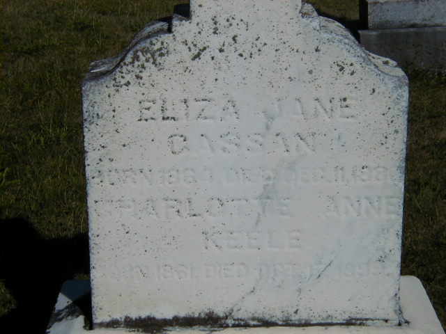 CEMSearch: Name: Eliza Jane Cassan; Born: 1864; Died: 1886-12-11; Buried: Christ Church Anglican Cemetery, Campbellford, plot 136; Other names: ? Keele, Ann Cassan (Smith) (1833-1925), Charlotte Anne Keele? (Cassan)(1861-1899), Edward Sheffield Cassan (1833-1907.)3,4