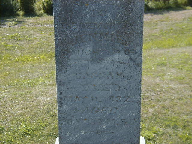 Jeannie Cassan was born on 6 October 1871 at Seymour Twp., Northumberland Co., Ontario; Date Oct 6 1871 per Memorial & CEMSearch. Date 1872 & location Ont. per 1881 Census.1,3,4 She appeared on the census of April 1881 at Seymour Twp., Northumberland Co., Ontario; Age 9 at 1881 Census: see Mathew Cassan.1 She died on 11 May 1892 at Seymour Twp., Northumberland Co., Ontario, at age 20; Date May 11 1892 per Memorial & CEMSearch.3,4 She was buried on 13 May 1892 at Christ Church Anglican Cemetery, Campbellford, Northumberland Co., Ontario; Memorial: (See Exhibit) To; The Memory of; Jennie; Daughter of; Matthew S. & Christina; Cassan; Died; May 11, 1892; Aged 20y 7m; & 5d (Christ Church Anglican Cemetery, Campbellford, Aug 11 2006)