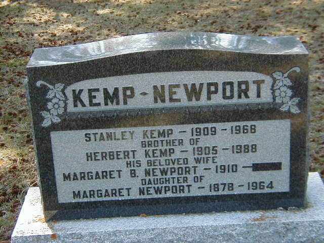 CemSearch: Name: Herbert Kemp; Born: 1905; Died: 1988; Age: 83y; ID: CSTLTNW024; Other names: Kemp, Margaret Beatrice [Newport] (1910-1998), Kemp, Stanley (1909-1968), Newport, Margaret (1878-1964); Cemetery: Castleton Cemetery, Conc 7 Lot 32, Cramahe Twp., Village of Castleton, Northumberland Co., Sec D-N Row 5 Plot 7; Note: Husband of Margaret B. Newport
