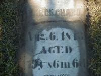 Note: This stone was partially under the grass and had to be cleared of sod and dirt in order to make out the inscription. The name "Barce" becomes clear once you get it cleaned off and look close. The year is less obvious; It certainly looks like 1813 since there is little evidence of any indentation to the left of the deep gash of the 1. There is a small mark and there is more than normal space between the 8 and the large gash of the 4. The spacing alone suggests it was once a 4. It also must be 1843 so the age of 79 years fits - if death is 1843 and birth 1764.3,7