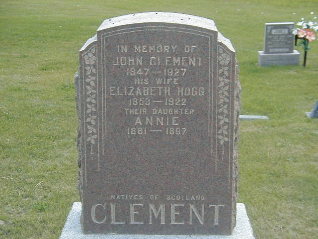 Elizabeth Hogg was born in 1853 at Scotland; Date 1853 & location Scoltland per Memorial.1 She married John Clement, son of William Clement and Ann McCullough, on 27 June 1876 at Inchinnan, Renfrewshire, Scotland; " ...John Clement, Grocer Master, Elizabeth Clement, M.S. Hogg, 1876, June 27, Inchinnan, Renfrewshire .. " from Extract of Birth Registration, a copy given to me by Fred Down, August 25, 2006. per Memorial. As of 27 June 1876,her married name was Clement.1 Elizabeth Hogg was buried in 1922 at McPhail's Cemetery, Brighton Twp., Northumberland Co., Ontario; Memorial: (See Exhibit) In Memory of; John Clement; 1847 - 1927; His Wife; Elizabeth Hogg; 1853 - 1922; Their daughter; Annie; 1881 - 1897; Natives of Scotland; CLEMENT (McPhail's Cemetery, Brighton Twp., Aug 25 2006.)1 She died in 1922 at Ontario; Date 1922 per Memorial.1