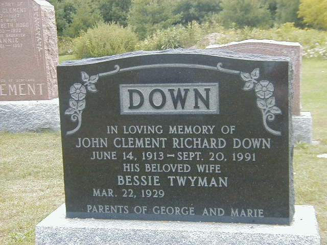 John Clement Richard Down was born on 14 June 1913 at Brighton Twp., Northumberland, Ontario; Date Jun 14 1913 per Memorial.1 He lived on 20 September 1935 at R. R. # 1, Hilton, Northumberland Co., Ontario; Informant for Death Reg'n. of his father William Wellington Down.2 He died on 20 September 1991 at Ontario at age 78; Date Sep 20 1991 per Memorial.1 He was buried on 23 September 1991 at McPhail's Cemetery, Brighton Twp., Northumberland Co., Ontario; Memorial: (See Exhibit) DOWN; In Loving Memory of; John Clement Richard Down; June 14, 1913 - Sept. 20, 1991; His Beloved Wife; Bessie Twyman; Mar. 22, 1929 - ; Plarents of George and Marie (McPhail's Cemetery, Brighton Twp., Aug 25 2006.)1