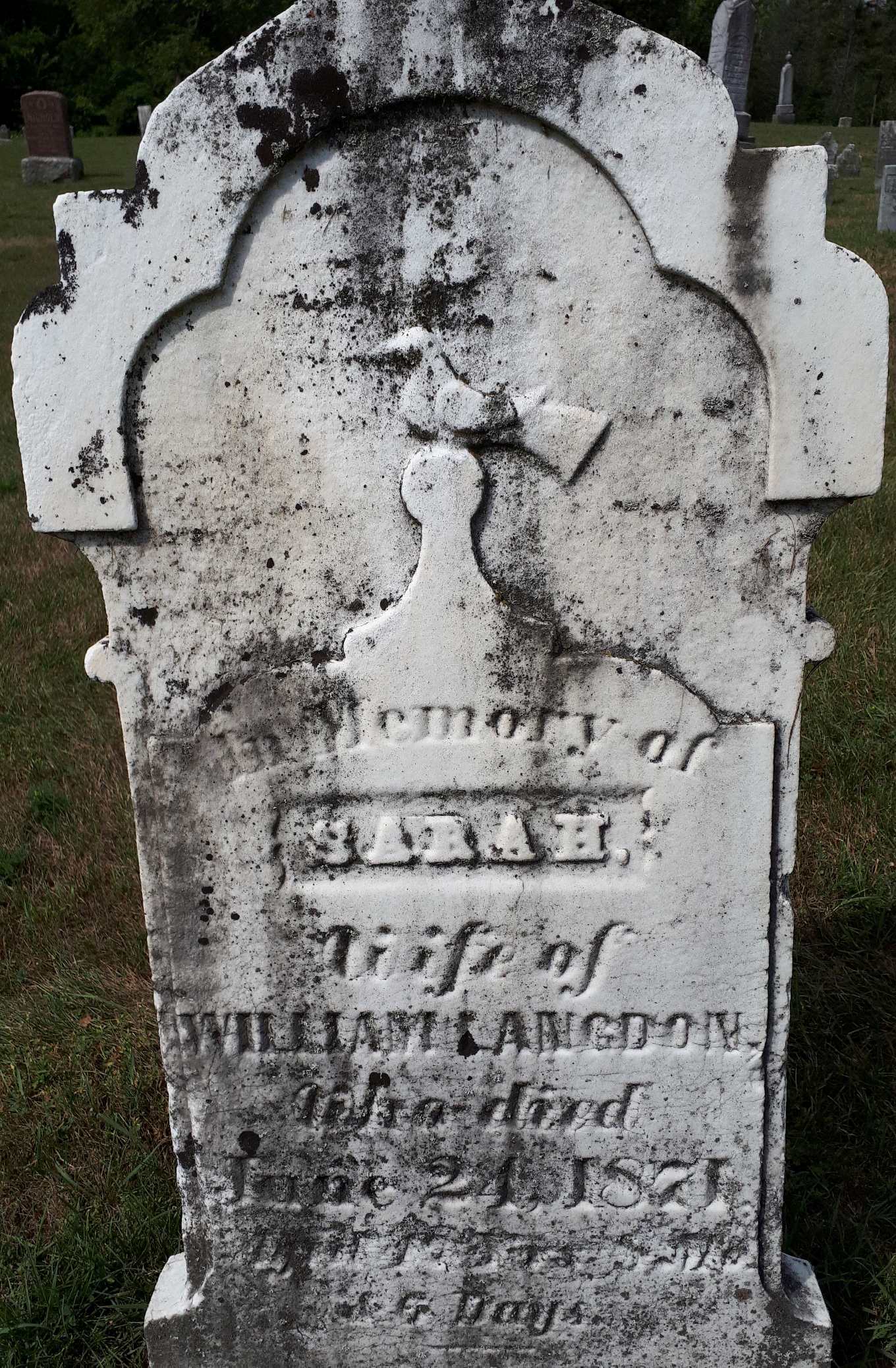 Sarah Loveless was born in 1820 at Prince Edward Co., Upper Canada; Date 1822 & location Ont. per 1871 Census. Date 1821 & location UC per 1861 Census. Date 1820 & location Cda. per 1851 Census. Location Prince Edward Co. per Death Reg'n. of daughter Martha (Langdon) Rawson.1,4,5,2 She married William Langdon, son of Joseph Langdon and Susan ?, on 15 May 1839 at Upper Canada; Date May 15 1839 per family tree of DwaShaMac on ancestry.con, May 24 2016. per 1851 Census.6 As of 15 May 1839,her married name was Langdon.1 Sarah Loveless appeared on the census of March 1852 at Brighton Twp., Northumberland Co., Canada West; Age 31 at 1851 Census: see William Langdon.1 She appeared on the census of April 1861 at Brighton Twp., Northumberland Co., Canada West; Age 40 at 1861 Census: see William Langdon.4 She appeared on the census of April 1871 at Brighton Twp., Northumberland Co., Ontario; Age 49 at 1871 Census: see William Langdon.5 She died on 24 June 1871 at Brighton Twp., Northumberland Co., Ontario; Date June 24 1871 per Memorial. Richard Cole remarried in 1873. Date Jun 27 1871 & location Brighton per family tree of DwaShaMac on ancestry.con, May 24 2016.3,6,7 She was buried on 26 June 1871 at Waite Cemetery, Cramahe Twp., Northumberland Co., Ontario; Memorial: (See Exhibit) In Memory of; Sarah; Wife of; William Langdon; Who Died; June21, 1871; Age: ?51 Y'r. ? Mo; & 6 Days (Waite Cemetery, Cramahe Twp., Aug 7 2018.)7