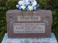 Norman Alexander Simpson was born on 20 June 1906 at Brighton Twp., Northumberland Co., Ontario; Birth Reg'n.#050045: Name: Norman Alexander Simpson; Date: Jun 20 1906; Parents: Darwin Simpson & Minnie Simpson; Occ.: teamster, Brighton; Phys. & Inf.: C. M. Sanford, MD, Brighton; Reg'd.: Jun 23 1906 (Ontario Birth Registration, anestry.com, #050045-1906) Date 1906 per Memorial. Date 1906 & location Ont. per 1921 Census.3,2,4 He appeared on the census of 1911 at Brighton, Northumberland Co., Ontario; Age 4 at 1911 Census: see Darwin Simpson.5 He appeared on the census of 16 June 1921 at Brighton, Northumberland Co., Ontario; Age 15 at 1921 Census: see Darwin Simpson.4 He married Elsie Pearl Adsit, daughter of William W. Adsitt and Annie Wilkins, on 20 November 1926 at Northumberland Co., Ontario; per family tree of Eudene123 on ancestry.com, Nov 13 2013.6 Norman Alexander Simpson died on 7 June 1966 at Northumberland Co., Ontario, at age 59; Date 1966 per Memorial. Date Jun 7 1966 per family tree of Eudene123 on ancestry.com, Nov 13 2013.6,2 He was buried on 9 June 1966 at Woods Cemetery, Cramahe Twp., Northumberland Co., Ontario; Memorial: (See Exhibit) SIMPSON; Norman A. Simpson 1906 - 1966; His Beloved Wife; E. Peark Adsit 1905 - 1957; Their Son; Douglas Darwin 1929 - 1938 (Woods Cemetery, Cramahe Twp., Jul 3 2004.)2