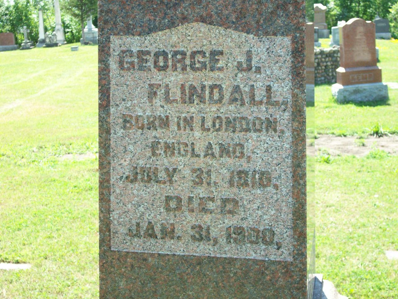 Date Jul 1810 & location Ont. per Death Reg'n. Date July 31, 1810 & location London, England per Memorial & CemSearch. Date 1816 & location England per 1871 Census. Date 1813 & location England per 1861 Census. Date 1809 & location England per 1851 Census.1,3,4,5,6,7,8 He One of Brighton's pioneers took three months to go from Quebec to Carrying Place by batteau. This was George J. Flindall who was born in London, England in 1810 and was only four years old when he came to Canada. THE BRIGHTON ENSIGN of February 16, 1900 in announcing his decease said: "George J. Flindall of Brighton formerly of Murray Township passed over the Great Divide on 31 January, emigrated to this country when but four years old, landed at Quebec and took three months more in a Bateaux to reach Carrying Place, where, he was transported by Asa Weller to the Waters of the Weller Bay." The Tobey Book, pg. 50. in 1814 at Murray Twp., Northumberland Co., Upper Canada.9 He "It was the 25th day of April 1815, and the family of John and Susannah Flindall were standing among many other emigrants; all feeling dwarfed by the tall rigging of the sailing ship "Tyne of London"; their vehicle to the new world." from "J.M. Flindall: The Uncommon Man", written and published by Ronald Donald and Linda Flindall of Cobourg, Ontario, 1988, pg. 115. on 25 April 1815 at London, England.8 He married Sarah Ann Stoneburgh, daughter of Peter Stoneburgh Jr. and Hanna Nix, before 1835 at Northumberland Co., Upper Canada; per 1851 Census.1 George James Flindall appeared on the census of 1839 at Murray Twp., Northumberland Co., Upper Canada; 1839 Census: George Flindall; 1 male over 16; 1 male under 16; 1 female over 16. He appeared on the census of 1840 at Murray Twp., Northumberland Co., Upper Canada; 1840 Census: George Flindall; 2 males under 16; 1 male over 16; 1 female under 16. He appeared on the census of 1841 at Murray Twp., Northumberland Co., Canada West; 1841 Census: George Flindall; 1 male over 16; 2 males under 16; 1 female over 16. He appeared on the census of 1848 at Conc C Lot 8, Murray Twp., Northumberland Co., Canada West; 1848 Census: George Flindall; Conc C, Lot 8, occ., prop; farmer. He appeared on the census of 1850 at Conc C Lot 8, Murray Twp., Northumberland Co., Canada West; 1850 Census: George Flindall; Conc C, Lot 8, occ., prop; Total 8 persons. He appeared on the census of 1852 at Murray Twp., Northumberland Co., Canada West; Age 42 at 1851 Census: Flindall, George J.?, 42, b. England, CE, yeoman, married; Sarah, 33, b. Cda., CE, married; Peter J., 15, b. Cda; Joseph E., 13; Mary Ann, 10; Hannah M., 8; J. F., 6; Henrietta, 3; Stoneburg, Adelade, 8, b. Cda., WM; Cadwell, 6 (1851 Census: Murray Twp., div. 1 - Conc C, Lot 8 & 9, 100 acres)