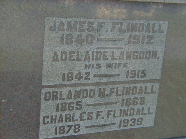 CEMSearch: Name: James F. Flindall; Born: 1840; Died: 1912; Notes: Husband of Adelaide Langdon; Buried: St. George's Anglican Cemetery, Trenton, Sec E Row 20; Other names: Adelaide Flindall (Langdon)(1842-1915), Charles F. Flindall (1878-1939), Emma Augusta Flindall (1869-1940), James Herbert Flindall (1875-1941), Orlando H. Flindall (1865-1868), Victoria May Flindall (1873-1942.)9,7