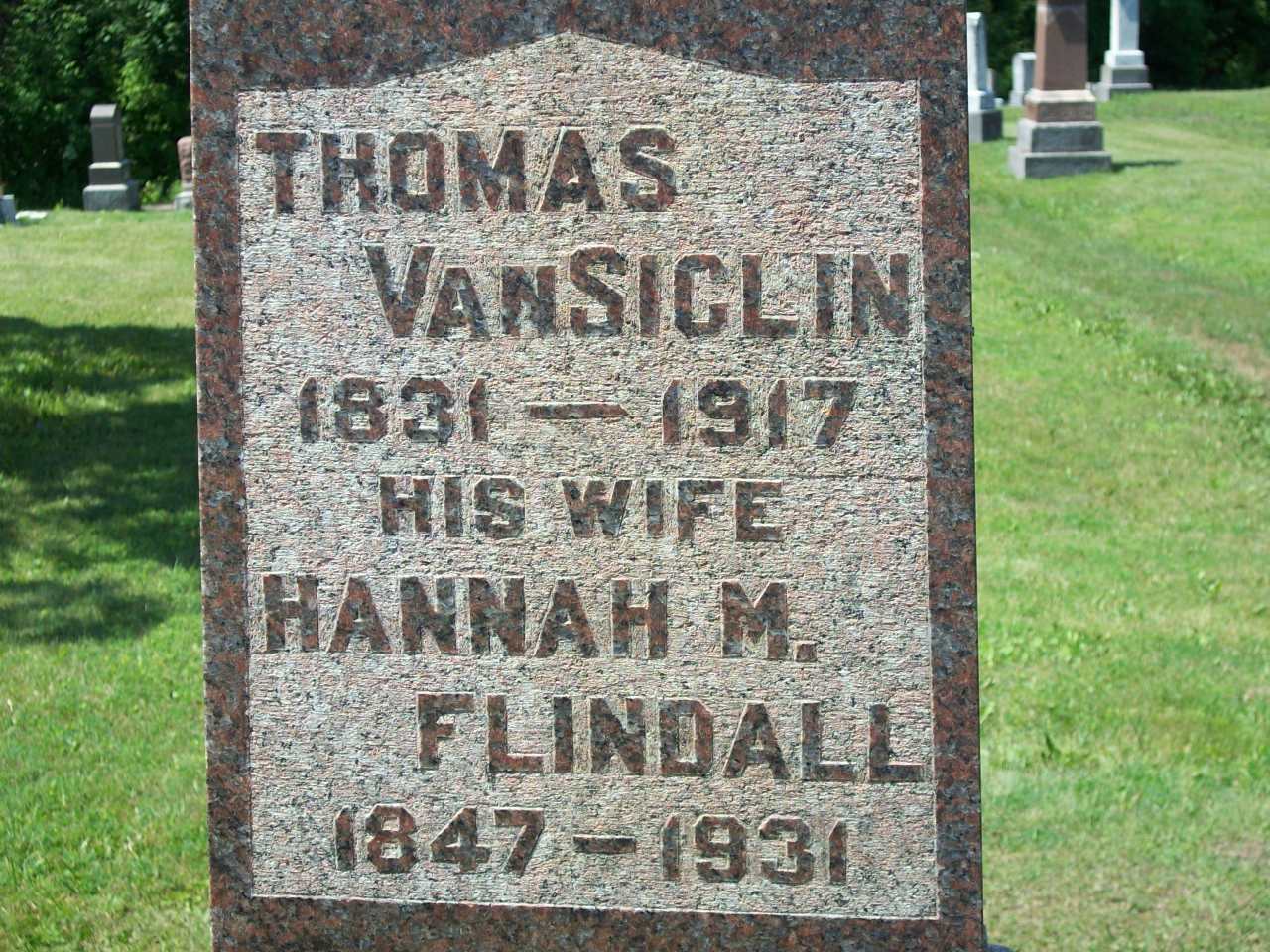 Hannah Maria Flindall was born on 18 September 1847 at Murray Twp., Northumberland Co., Canada West; Date 1847 per Memorial & CEMSearch. Date Sep 18 1847 & location Ont. per Death Reg'n. Date 1847 & location Ont. per 1881 Census. Date 1845 & location UC per 1861 Census. Date 1843 & location CDa. per 1851 Census. Date Sep 18 1847 & location Ont. per Death Reg'n.1,3,2,4,5,6 She appeared on the census of 1851 at Murray Twp., Northumberland Co., Canada West; Age 8 at 1851 Census: see George Flindall.1 She appeared on the census of April 1861 at Murray Twp., Northumberland Co., Canada West; Age 16 at 1861 Census: see George Flindall.3 As of circa 1867,her married name was Vansicklen.7 She married Thomas Vansicklen, son of Ferdinand Vansicklen and Diadema Lawson, circa 1867 at Brighton Twp., Northumberland Co., Canada West; per 1871 Census. per 1901 Census.7,8 Hannah Maria Flindall appeared on the census of April 1871 at Brighton Twp., Northumberland Co., Ontario; Age 24 at 1871 Census: see Thomas Vansicklen.8 She appeared on the census of April 1881 at Brighton Twp., Northumberland Co., Ontario; Age 34 at 1881 Census: see Thomas Vansicklen.4 She lived on 15 December 1885 at Village Lot 1, North of Singleton St., Brighton, Northumberland Co., Ontario; Land Registry Records (B&S 2023) show that Lewis A. Purdy & wife sold Village Lot 1, north of Singleton St., Brighton, Northumberland Co. to Hannah M. Vansicklin for $1,300. ITS Date: Dec 15 1885. Reg. Date: Dec 17 1885. (Ontario Land Registry Records, Northumberland Co., Brighton Village, Book 009, North Side of Singleton, Lot 1, pg. 009 of 220, pg. 01, page copied from OnLand.ca Feb 4 2022 by Dan.)9 She appeared on the census of April 1901 at Brighton, Northumberland Co., Ontario; Age 52 at 1901 Census: see Thomas Vansicklen.7 She lived on 27 December 1911 at Village Lot 2, North of Singleton St., Brighton, Northumberland Co., Ontario; Land Registry Records (B&S 5087) show that Thomas Vansicklin sold Village Lot 2, north of Singleton St., Brighton, Northumberland Co. to Hannah M. Vansicklin for $1. ITS Date: Dec 27 1911. Reg. Date: Dec 30 1915. (Ontario Land Registry Records, Northumberland Co., Brighton Village, Book 009, North Side of Singleton, Lot 2, pg. 012 of 220, pg. 01, page copied from OnLand.ca Feb 4 2022 by Dan.)9 She appeared on the census of 27 December 1911 at Village Lot 15, Young St. East, Brighton, Northumberland Co., Ontario; Land Registry Records (Grant 5087) show that Thomas Vansicklen granted "said lot", Village Lot 15, Village of Brighton, Northumberland Co. to Hannah M. Vansicklen for $1. ITS Date: Dec 27 1911. Reg'n. Date: Dec 30 1911. (Ontario Land Registry Records, Northumberland Co., Brighton Village, Book 009, Village Lot 15, Young St. East, page 213 of 220, OnLand.ca.)9 She appeared on the census of 27 December 1911 at Village Lot 15, Young St. East, Brighton, Northumberland Co., Ontario; Land Registry Records (Grant 5667) show that Hannah M. Vansicklen sold "said lot", Village Lot 15, Village of Brighton, Northumberland Co. to Charles A. Reddick for $3,000. ITS Date: Sep 30 1921. Reg'n. Date: Oct 3 1921. (Ontario Land Registry Records, Northumberland Co., Brighton Village, Book 009, Village Lot 15, Young St. East, page 213 of 220, OnLand.ca.)9 She Her husband, Thomas Vansicklin, died Nov 12 1917. on 12 November 1917 at Brighton, Northumberland Co., Ontario. She lived on 1 October 1921 at Village Lot 2, North of Singleton St., Brighton, Northumberland Co., Ontario; Land Registry Records (B&S 5667) show that Hannah M. Vansickin (widow) sold Village Lot 2, north of Singleton St., Brighton, Northumberland Co. to Charles A. Reddick for $3,000. ITS Date: Oct 1 1921. Reg. Date: Oct 3 1921. (Ontario Land Registry Records, Northumberland Co., Brigton Village, Book 009, North Side of Singleton, Lot 2, pg. 012 of 220, pg. 01, page copied from OnLand.ca Feb 4 2022 by Dan.)9 She lived on 1 October 1921 at Village Lot 1, North of Singleton St., Brighton, Northumberland Co., Ontario; Land Registry Records (B&S 5667) show that Hannah M. Vansickin (widow) sold Village Lot 1, north of Singleton St., Brighton, Northumberland Co. to Charles A. Reddick for $3,000. ITS Date: Oct 1 1921. Reg. Date: Oct 3 1921. (Ontario Land Registry Records, Northumberland Co., Brigton Village, Book 009, North Side of Singleton, Lot 1, pg. 009 of 220, pg. 01, page copied from OnLand.ca Feb 4 2022 by Dan.)9 She died on 20 November 1931 at Brighton, Northumberland Co., Ontario, at age 84; Death Reg'n.#025671: Name: Hannah Maria Van Siclen; Date: Nov 20 1931; Age: 84y 2m 1d; Res.: Brighton Village; Born: Ont. Sep 18 1847; Status: widow; Res. at place of Death: 16 yrs; Parents: George Findall, b. London, England & Sarah Stoneburg, b. Ont; Inf.: Miss Estella Proctor, Brighton, friend; Burial: ?? Cemetery, Nov 25 1931; Und.: B. E. Brintnell, Brighton; Reg'd.: Nov 24 1931; Reg'r.: F. M. Dure, Coroner (Ontario Death Registration, #025671-1931, ancestry.com.)10 She was buried on 22 November 1931 at Mount Hope Cemetery, Brighton, Northumberland Co., Ontario; Memorial: (See Exhibit) Thomas VanSiclin; 1831 - 1917; His Wife; Hannah M; Flindall; 1847 -1931 (Mount Hope Cemetery, Brighton, June 30 2008)