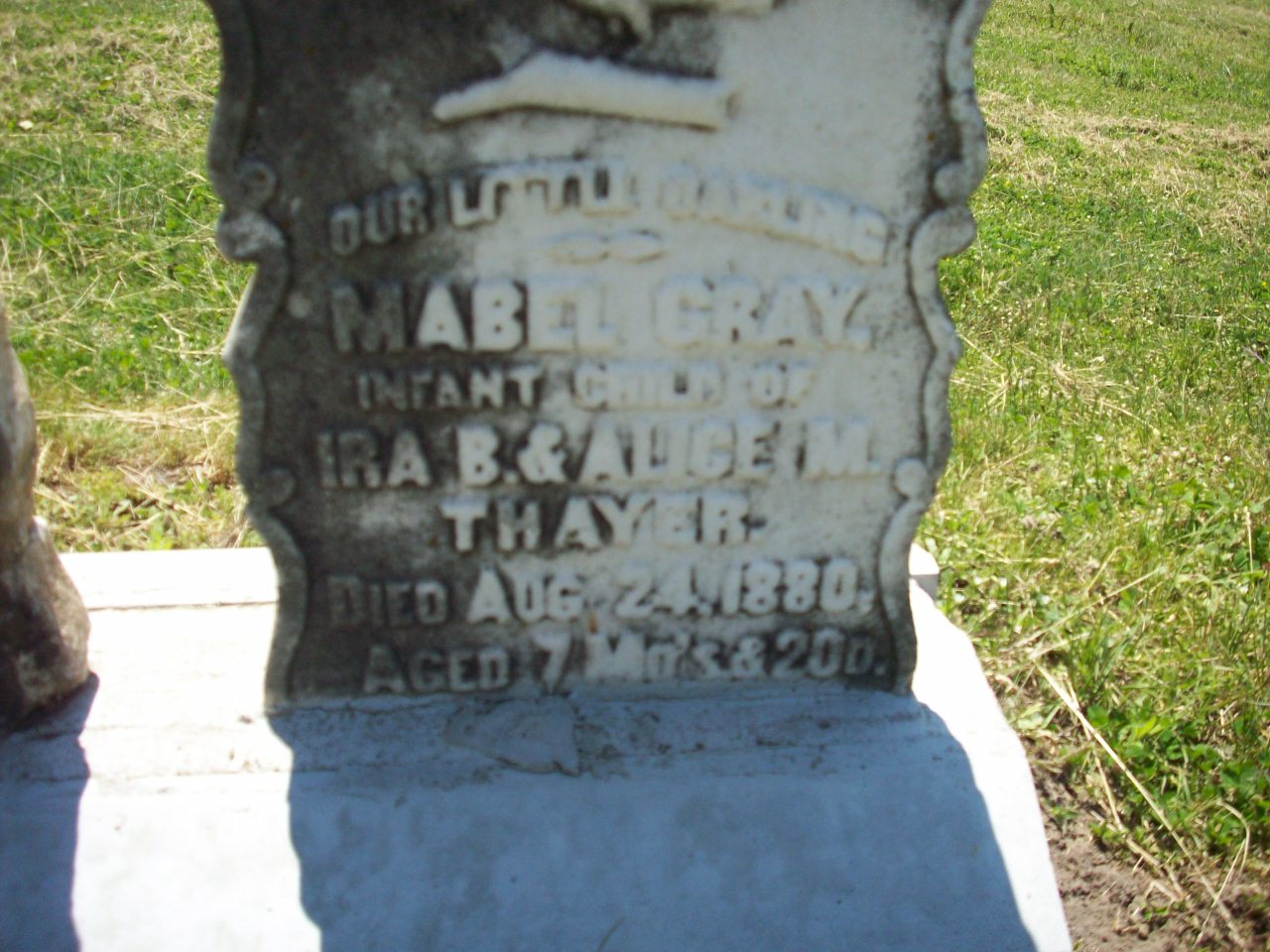 Mabel Gray Thayer was born on 24 January 1880 at Brighton, Northumberland Co., Ontario; Birth Reg'n.#022242: Name: Mabel Gray Thayer; Date: Jan 24 1880; Parents: Ira Blanchard Thayer & Alice Maud Potter; Inf.: Ira B. Thayer, Merchant, Brighton; Reg'd.: Mar 1 1880; Phys.: A. E. Fife, MD; Reg'r.: M. K. Lockwood (Ontario Birth Registration, #022242-1880, ancestry.com.)2 She died on 24 August 1880 at Brighton, Northumberland Co., Ontario; Date Aug 24 1880 per Memorial.3 She was buried on 26 August 1880 at Mount Hope Cemetery, Brighton, Northumberland Co., Ontario; Memorial: (See Exhibit) Out Little Darling; Mabel Gray; Infant Child of; Ira B. & Alice M; Thayer; Died Aug 24, 1880; Aged 7 Mo's & 20d (Mount Hope Cemetery, Brighton, June 5, 2009.)3