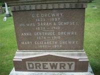 CemSearch: Name: C. E. Drewry; Born: 1835; Died: 1897; ID: SALEM0367; Other names: Drewry, Anna Gertrude (1874-1912), Drewry, Mary Elizabeth (1881-1902), Drewry, Sarah A. [Dempsey](1838-1910), Loftis, Lillian ( - 1947); Cemetery: Salem Cemetery, Conc 1 Lot 21, Cramahe Twp., Northumberland Co., Sec 2 Row 24 Plot 15 (https://www.cemsearch.ca/burial/?pid=SALEM0367%5E0.)5,6