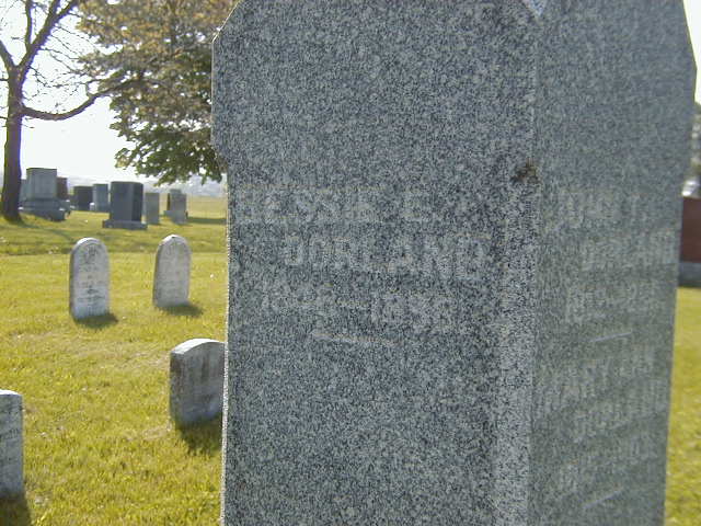 Bessie E. Dorland was born in 1846 at Hillier Twp., Prince Edward Co., Ontario; Date 1848 & location Ont. per 1871 Census. Date 1846 & location Cda. per 1861 Census. Date 1845 & location Cda. per 1851 Census. Date 1846 per Memorial.1,2,4,3 She appeared on the census of 1852 at Hillier Twp., Prince Edward Co., Ontario; Age 6 at 1851 Census: see John T. Dorland.4 She appeared on the census of April 1861 at Hillier Twp., Prince Edward Co., Ontario; Age 15 at 1861 Census: see John T. Dorland.1 She appeared on the census of April 1871 at Wellington, Prince Edward Co., Ontario; Age 23 at 1871 Census: see John T. Dorland.2 She was buried in 1896 at Wellington Cemetery, Wellington, Prince Edward Co., Ontario; Memorial: (See Exhibit) Bessie E; Dorland; 1846 - 1896 (Wellington Cemetery, Wellington, May 28 2006.)3 She died in 1896 at Ontario; Date 1896? per Memorial.3