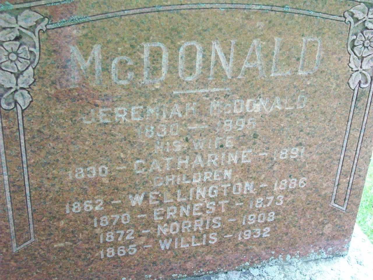 CemSearch: Name: Jeremiah McDonald; Born: 1830; Died: Nov. 12 1896; Age: 66; ID: SALEM0512; Other names: McDonald, Catharine (1830-1891), McDonald, Norris (1872-1908), McDonald, Wellington (1862-1886), McDonald, Willis (1865-1932); Cemetery: Salem Cemetery, Conc 1 Lot 21, Cramahe Twp., Sedc 2 Row 19 Plot 5 (https://www.cemsearch.ca/burial/?pid=SALEM0512%5E0.)3,4