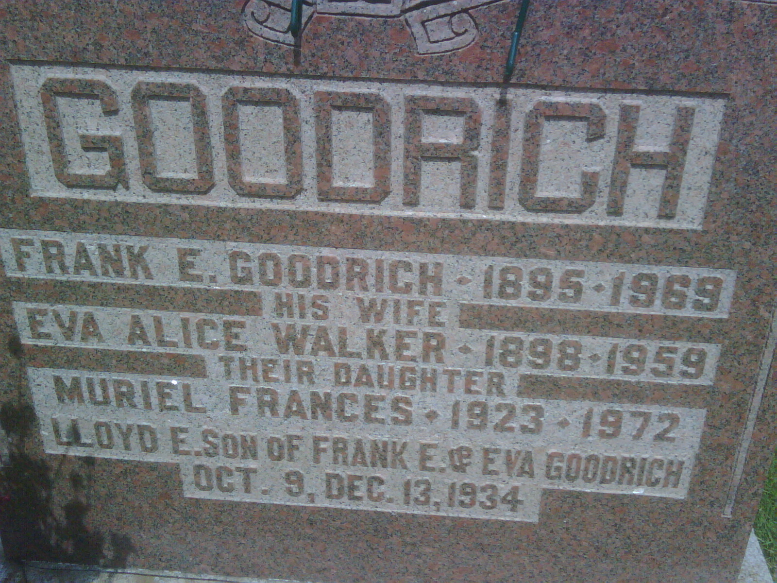 Lloyd Everett Goodrich was born on 9 October 1934 at Belleville General Hospital, Belleville, Northumberland Co., Ontario; Date Oct 9 1934 per Memorial. Date Oct 9 1934 & location Belleville General Hospital per Death Reg'n. per marriage reg'n. of daugher Ida (MacDonald) Goodrich.1,3,2 He died on 13 December 1934 at Cramahe Twp., Morganston, Northumberland Co., Ontario; Death Reg'n.#025580: Name: Lloyd Everett Goodrich; Date: Dec 13 1934; Age: 2m 4d; Res.: Morganston; Born: Belleville Geneal Hospital, Oct 9 1934; Parents: Frank E. Goodrich & Eva Walker, b. Ont; Inf.: F. E. Goodrich, Morganston, father; Burial: Cramahe Twp., Dec 15 1934; Und.: B. E. Buchanan, Warkworth; Reg'd.: JUn 5 1935; Reg'r.: G. R. Beavis (Ontario Death Registration, #025580-1935, ancestry.com) Date Dec 13 1934 per Memorial. per marriage reg'n. of daugher Ida (MacDonald) Goodrich.1,3,4 He was buried on 15 December 1934 at Salem Cemetery, Cramahe Twp., Northumberland Co., Ontario; Memorial: (See Exhibit) GOODRICH; Frank E. Goodrich - 1895 - 1969; His Wife; Eva Alice Walker - 1898 - 1959; Their Daughter; Muriel Frances - 1923 - 1972; Lloyd E. son of Frank E. & Eva Goodrich; Oct. 9, Dec. 13, 1934 (Salem Cemetery, Cramahe Twp., July 6 2009.)3