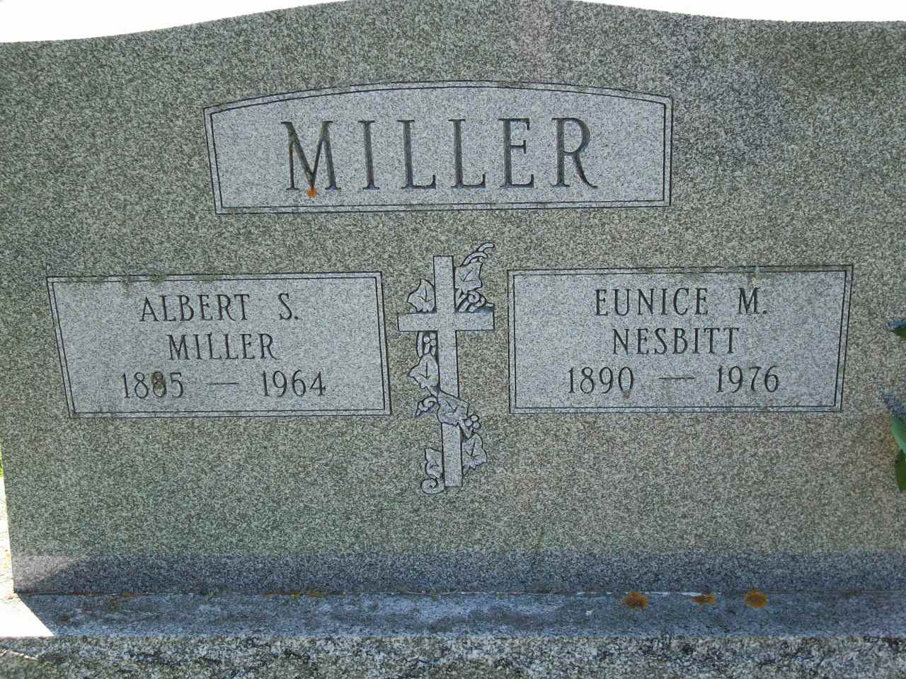 CemSearch: Name: Eunice M. Nesbitt; Born: 1890; Died: 1976; ID: MTHOPE660; Other name: Miller, Albert S. (1885-1964); Cemetery: Mount Hope Cemetery, Conc A, Lot 35, Brighton Twp., Brightoon Village, Northumberland Co., Sec 2 Row 9 (https://www.cemsearch.ca/burial/?pid=MTHOPE660%5E1) Date of Death Mar 19 1976 per Death Reg'n. Location Mount Hope Cemetery, Brighton per Death Notice.11,12,13,14