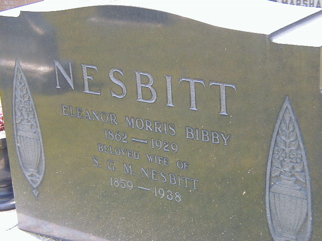 per marr. of son Edwin Nesbitt. per 1901 Census.9,2 As of 14 April 1884,her married name was Nesbitt.1,2 Eleanor Morris "Nellie" Bibby appeared on the census of April 1891 at Brighton, Northumberland Co., Ontario; Age 29 at 1891 Census: see Samuel Nesbitt.7 She appeared on the census of April 1901 at Brighton, Northumberland Co., Ontario; Age 38 at 1901 Census: see Samuel Nesbitt.2 She appeared on the census of 1911 at Brighton, Northumberland Co., Ontario; Age 49 at 1911 Census: see Samuel Nesbitt.8 She died on 9 September 1929 at Toronto, York Co., Ontario, at age 67; Death Reg'n.#006763: Name: Eleanor Morris Nesbitt; Date: Sep 9 1929; Age: 67 yrs; Place: St. Michael's Hospital, Toronto; Born: Brighton Sep 1862; Status: married; Res. at place of Death: 5 days; Parents: Edwin (John is crossed out) Bibby, b. Cda. & Jane (Johnson is crossed out) Morris, b. Eng; Phys.: Dr. M.Crawford, Toronto ; Inf.: Mr. Nesbitt, Brighton, son; Burial: Sep 12 1929; Und.: F. J. McArthur, Cobourg; Cause: cereberal hemmhorage; Reg'd.: Sep 17 1929 (Ontario Death Registration, #006763-1929, ancestry.com.)10 She was buried on 11 September 1929 at Mount Hope Cemetery, Brighton, Northumberland Co., Ontario; Memorial: NESBITT; Eleanor Morris Bibby; 1862 - 1929; Beloved Wife of; S. G. M. Nesbitt; 1859 - 1938 (Mount Hope Cemetery, Brighton, June 30 2008.)4