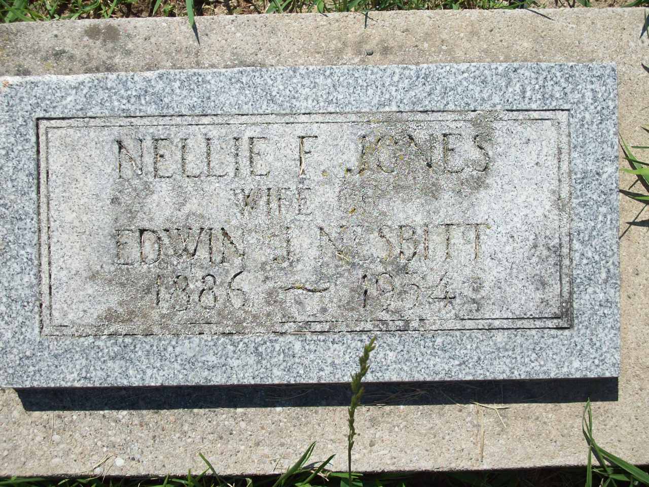 Nellie Foster Jones was born on 17 September 1886 at Athens, Leeds Co., Ontario; Date 1886 per Memorial. Date 1887 & location Ont. per 1911 Census. Date Sep 17 1886 & location Ont. urban per 1901 Census. Date 1887 & location Ont. per 1891 Census. Date 1887 & location Athens?? per marr. reg'n. Date Sep 17 1886 & location Athens, Leeds Co. per family tree of RCGadsby on ancestry.com, Jul 13 2014.1,3,4,2,5,6 She appeared on the census of April 1891 at Pakenham, North Leeds Co., Ontario; Age 4 at 1891 Census: see Robert Nelson Jones.2 She appeared on the census of 9 April 1901 at Eganville, North Renfrew Co., Ontario; Age 14 at 1901 Census: see Robert N. Jones.6 She appeared on the census of 1911 at Kingsley Ave., Brighton, Northumberland Co., Ontario; Age 24 at 1911 Census: see Elva C. Jones (mother.)5 As of 5 June 1912,her married name was Nesbitt.1 She lived on 5 June 1912 at Brighton, Northumberland Co., Ontario; Residence Brighton per marr. reg'n.1 She married Edwin James Nesbitt, son of Samuel Grierson Murray Nesbitt and Eleanor Morris "Nellie" Bibby, on 5 June 1912 at St. Paul's Church, Brighton, Northumberland Co., Ontario; Marriage Reg'n.#015007: Groom: Edwin James Nesbitt; Age: 27; Res. & Born: Brighton; Status: bachelor; Rel.: Pres; Parents: Samuel Grierson Murray Nesbitt, mason? & Eleanor M. Bibby; Bride: Nellie Foster Jones; Age: 25; Res.: Brighton; Born: Athens; Status: spinster; Rel.: CE; Parents: Robert Jones, Clergyman & Elva C. Flagler; Wit.: Edith E. Nesbitt, Brighton & Malcolm C. Butler, Brighton; Date: Jun 5 1912; Place: St. Paul's Church, Brighton; Performed by: E. C. Cayley, Toronto; Sworn: Brighton, June 3 1912 (Ontario Marriage Registration, #015007-1912, ancestry.com.)7 Nellie Foster Jones died in 1954 at Ontario; Date 1954 per Memorial.3 She was buried in 1954 at Mount Hope Cemetery, Brighton, Northumberland Co., Ontario; Memorial: (See Exhibit) Nellie F. Jones; Wife of; Edwin J. Nesbitt; 1886 - 1954 (Mount Hope Cemetery, Brighton, June 30 2008.)2
