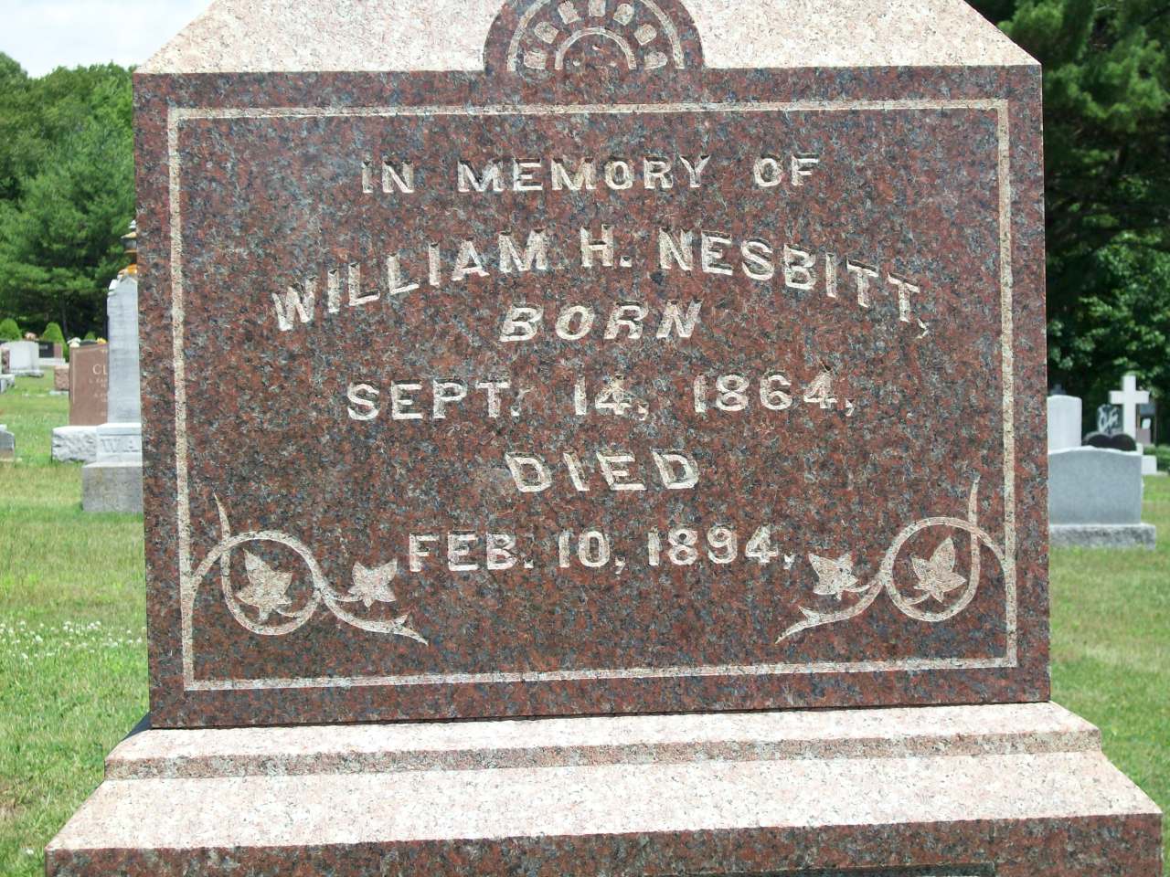 William H. Nesbitt was born on 14 September 1864 at Brighton, Northumberland Co., Canada West; Date Sep 14 1864 per Memorial. Date 1866 & location Ont. per 1891 Census. Date 1866 & location Ont. per 1881 Census. Date 1865 & location Ont. per 1871 Census.1,2,3,4 He appeared on the census of April 1871 at Brighton, Northumberland Co., Ontario; Age 6 at 1871 Census: see James Nesbitt.1 He appeared on the census of April 1881 at Brighton, Northumberland Co., Ontario; Age 15 at 1881 Census: see James Nesbitt.3 He appeared on the census of April 1891 at Brighton, Northumberland Co., Ontario; Age 25 at 1891 Census: see James Nesbitt.4 He died on 10 February 1894 at Ontario at age 29; Date Feb 10 1894 per Memorial.2 He was buried on 12 February 1894 at Mount Hope Cemetery, Brighton, Northumberland Co., Ontario; Memorial: (See Exhibit) In Memory of; William H. Nesbitt; Born; Sept. 14, 1864; Died; Feb 10, 1894 (Mount Hope Cemetery, Brighton, June 30 2008.)2