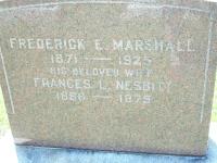 Frances Louise Nesbitt was born on 5 September 1886 at Brighton, Northumberland Co., Ontario; Date 1885 & location Ont. per 1921 Census. Date Sep 1886 & location Ont. per 1911 Census. Date Sep 5 1886 & location Ont. rural per 1901 Census. Date 1887 & location Ont. per 1891 Census. Date 1886 per marr. reg'n.1,4,5,3,6 She appeared on the census of April 1891 at Brighton, Northumberland Co., Ontario; Age 4 at 1891 Census: see Samuel Nesbitt.4 She appeared on the census of April 1901 at Brighton, Northumberland Co., Ontario; Age 14 at 1901 Census: see Samuel Nesbitt.1 As of 14 October 1908,her married name was Marshall.2 She lived on 14 October 1908 at Brighton, Northumberland Co., Ontario; Residence Brighton per marr. reg'n.3 She married Frederick Edward Marshall, son of John Alexander Marshall and Martha Dezell, on 14 October 1908 at Brighton, Northumberland Co., Ontario; Marriage Reg'n.#014419: Groom: Frederick Edward Marshall; Age: 37; Res.: Brighton; Status: bachelor; Occ.: Druggist; Rel.: Pres; Parents: John A. Marshall, retired & Martha Deyell; Bride: Frances Louise Nesbitt; Age: 22; Res.: Brighton; Status: spinster; Rel.: Anglican; Parents: Samuel G. M. Nesbitt, manufacturer & Nellie Bibby; Wit.: Tom Lockwood & Bessie Morrow, Brighton; Date: Oct 14, 1908; Place: Brighton; Performed by: A. K. McLeod, Brighton; Reg'd.: Nov 9 1908; Reg'r.: T. C. Lockwood, Brighton (Ontario Marriage Registration, #014419-1908, ancestry.ca) per Memorial.2,7 Frances Louise Nesbitt appeared on the census of 1911 at Main St., Brighton, Northumberland Co., Ontario; Age 24 at 1911 Census: see Fred E. Marshall.5 She appeared on the census of 11 June 1921 at Ward 2, Brighton, Northumberland Co., Ontario; Age 36 at 1921 Census: see Frederick Marshall.6 She lived on 20 December 1921 at Village Lot 12, Main St. South (127), Brighton, Northumberland Co., Ontario; Land Registry Records (Grant 6497) show that Frederick E. Marshall sold "part .. lying between Main and Richardson Sts.", part of lot 2 conc 1, Brighton Twp., Northumberland Co. to Francis L. Marshall for $1. ITS Date: Dec 20 1921. Reg'n. Date: Jun 10 1931. (Ontario Land Registry Records, Northumberland Co., Brighton Village, Book 014, pg. 126 of 210, page copied from OnLand.ca by Dan Buchanan, Nov 6 2022.)8 She lived on 9 September 1946 at Village Lot 12, Main St. South (127), Brighton, Northumberland Co., Ontario; Land Registry Records (Grant 7699) show that Francis L. Marshall sold "part marked Estate of late Abijah Squier", part of lot 2 conc 1, Brighton Twp., Northumberland Co. to Nesbitt Canning Co. Ltd. for $5,000. ITS Date: Sep 9 1946. Reg'n. Date: Sep 27 1946. (Ontario Land Registry Records, Northumberland Co., Brighton Village, Book 014, pg. 132 of 210, page copied from OnLand.ca by Dan Buchanan, Nov 6 2022.)8 She lived on 9 September 1946 at Conc 1 Lot 2, Brighton Twp., Brighton, Northumberland Co., Ontario; Land Registry Records (Grant 7699) show that Francis L. Marshall sold "part marked Estate of late Abijah Squier", part of lot 2 conc 1, Brighton Twp., Northumberland Co. to Nesbitt Canning Co. Ltd. for $5,000. ITS Date: Sep 9 1946. Reg'n. Date: Sep 27 1946. (Ontario Land Registry Records, Northumberland Co., Brighton Village, Book 014, pg. 132 of 210, page copied from OnLand.ca by Dan Buchanan, Nov 6 2022.) (Note: This may be 127 Main St.)8 She was buried in 1975 at Mount Hope Cemetery, Brighton, Northumberland Co., Ontario; Memorial: (See Exhibit) Frederick E. Marshall; 1871 - 1925; His Beloved Wife; Frances L. Nesbitt; 1886 - 1975 (Mount Hope Cemetery, Brighton, June 30 2008.)2 She died in 1975 at Ontario; Date 1975 per Memorial.2