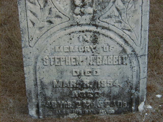 CEMSearch: Name: Stephen Babbit; Born: 1846; Died: 1894-03-08; Age: 48y 2m 24d; Buried: Warkworth Cemetery, Percy Twp., Sec 2 Row 2 Plot 21; Other names: Archibald Babbit (1874-1881), Margaret S. Babbit (1875-1893), William Babbit, 1881-1886.)5,6
