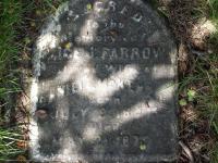 Alice J. Farrow was born on 9 July 1845 at Cramahe Twp., East Northumberland Co., Canada West; Date July 9? 1847? per Memorial. Date 1848 & location Ont. per 1871 Census. Date 1845 & location Cda. per 1851 Census. Date 1847 & location Cda. per marr. reg'n.1,2,3,4 She appeared on the census of 1852 at Cramahe Twp., Northumberland Co., Canada West; Age 6 at 1851 Census: see George Farrow.3 She appeared on the census of April 1871 at Cramahe Twp., East Northumberland Co., Ontario; Age 23 at 1871 Census: see George Farrow.4 As of 26 December 1871,her married name was McKenzie.1 She married Daniel Lovett McKenzie, son of Jacob Walter McKenzie and Catherine Lovett, on 26 December 1871 at Cramahe Twp., Northumberland Co., Ontario; Marriage Reg'n.: Groom: Daniel Lovitt McKenzie; Age: 36; Res.: Seymour; Born: Cda; Status: bachelor; Occ.: farmer; Parents: Jacob w. & Catherine McKenzie; Bride: Alice Farrow; Age: 24; Res.: Cramahe; Born: Cda; Status: spinster; Parents: George & Martha Farrow; Wit.: John A. Farrow, Cramahe & Adeline McKenzie, Percy; Date: Dec 26 1871; Place: Cramahe; Rel.: M. E. Church & Wesleyan; Peformed by: Ebenezer Robson (Ontario Marriage Registration, ancestry.com.)1 Alice J. Farrow died on 21 May 1876 at Northumberland Co., Ontario, at age 30; Date May 21 1876 per Memorial. Year 1876 confirmed by viewing stone May 22 2018, per email from Nell Tenhaaf.2,5 She was buried on 23 May 1876 at Salem Cemetery, Cramahe Twp., Salem, Northumberland Co., Ontario; Memorial: (See Exhibit) Sacred; to the; Memory of; Alice J. Farrow; Beloved Wife of; Daniel McKenzie; Born: July 9? 1847?; Died; May 21 1876 (Salem Cemetery, Salem, CramaheTwp., July 6 2009)